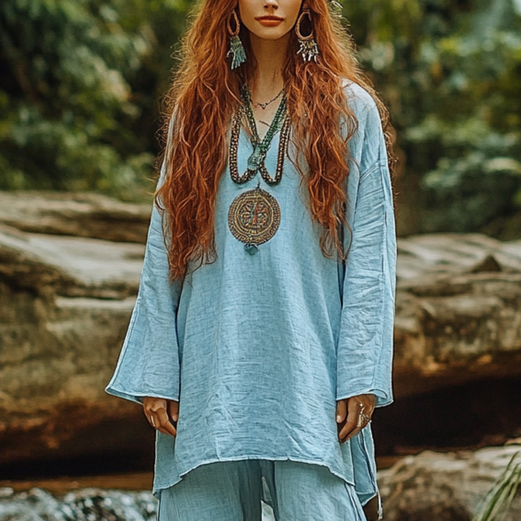 Bohemian Holiday Style Vintage Embroidered Floral Totem Print Casual Top