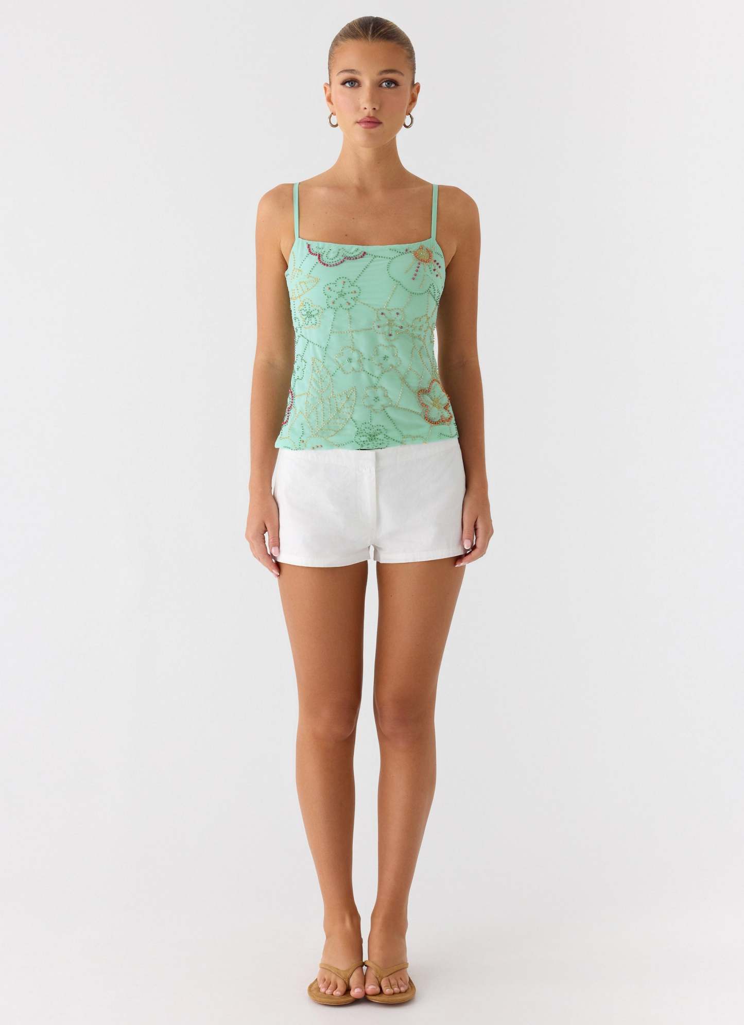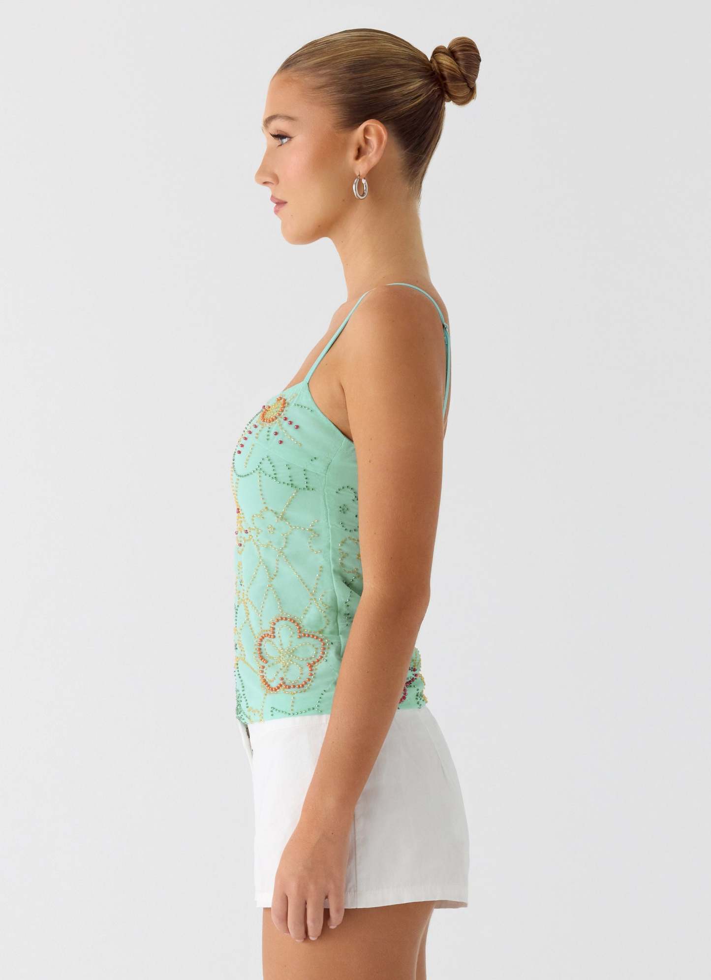 The Be Alright Beaded Top is designed for nights that sparkle with every move. Featuring a body-hugging fit and thin adjustable straps, this statement piece is adorned with a fully beaded pattern and finished with a sleek side invisible zipper. Perfect for golden hour moments that glide seamlessly into after-dark glamour.
