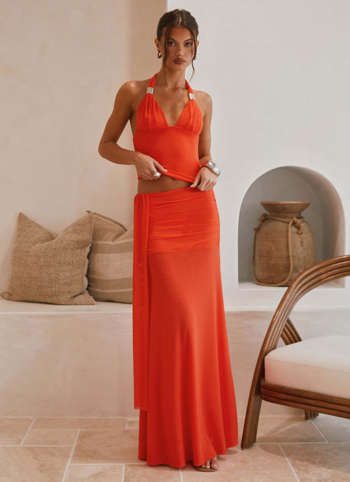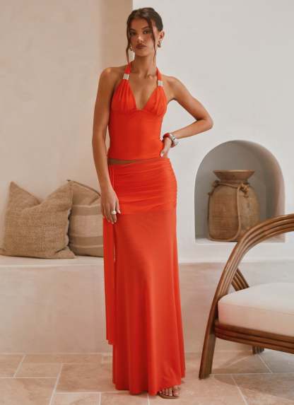The Blaze Maxi Skirt is made for bold nights and vibrant energy. Featuring a low rise with ruched waistband and side sash, this fully lined stretch mesh maxi skirt offers a flattering silhouette in a fiery red hue.