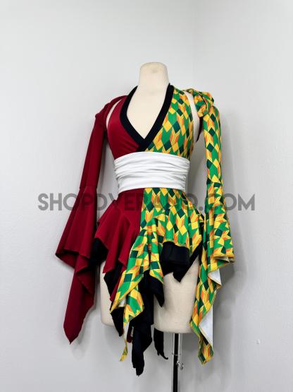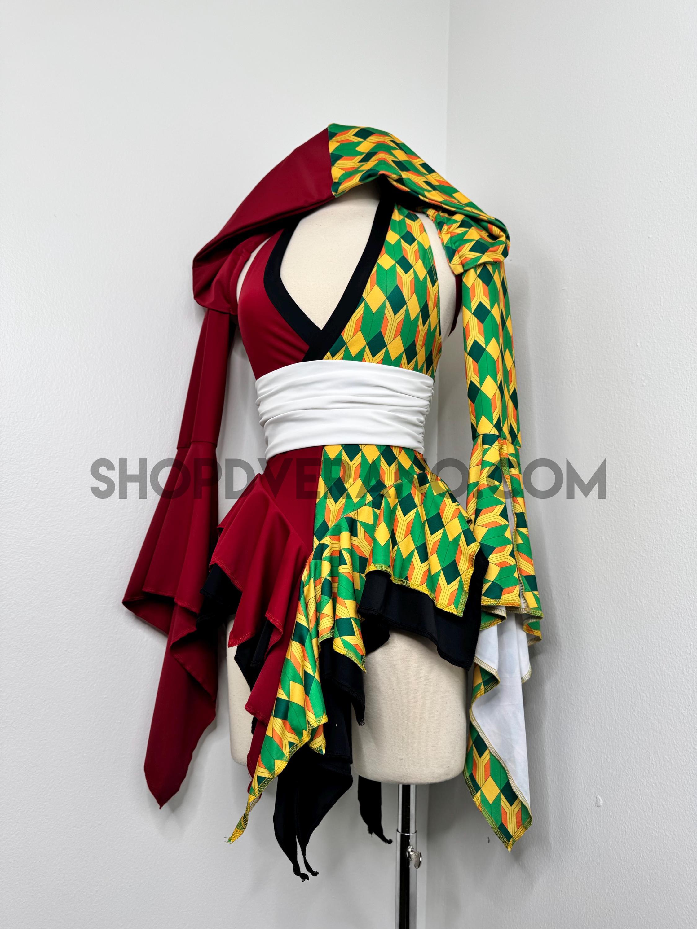Designed with a bold asymmetrical color story, the Chilltide Fairy Set features a striking combination of half burgundy, and half emerald green & golden yellow geometric patterns, black accents, and a contrasting white waist wrap. The layered textures and contrasting panels create visual movement that reflects the balance between calm control and quiet power.