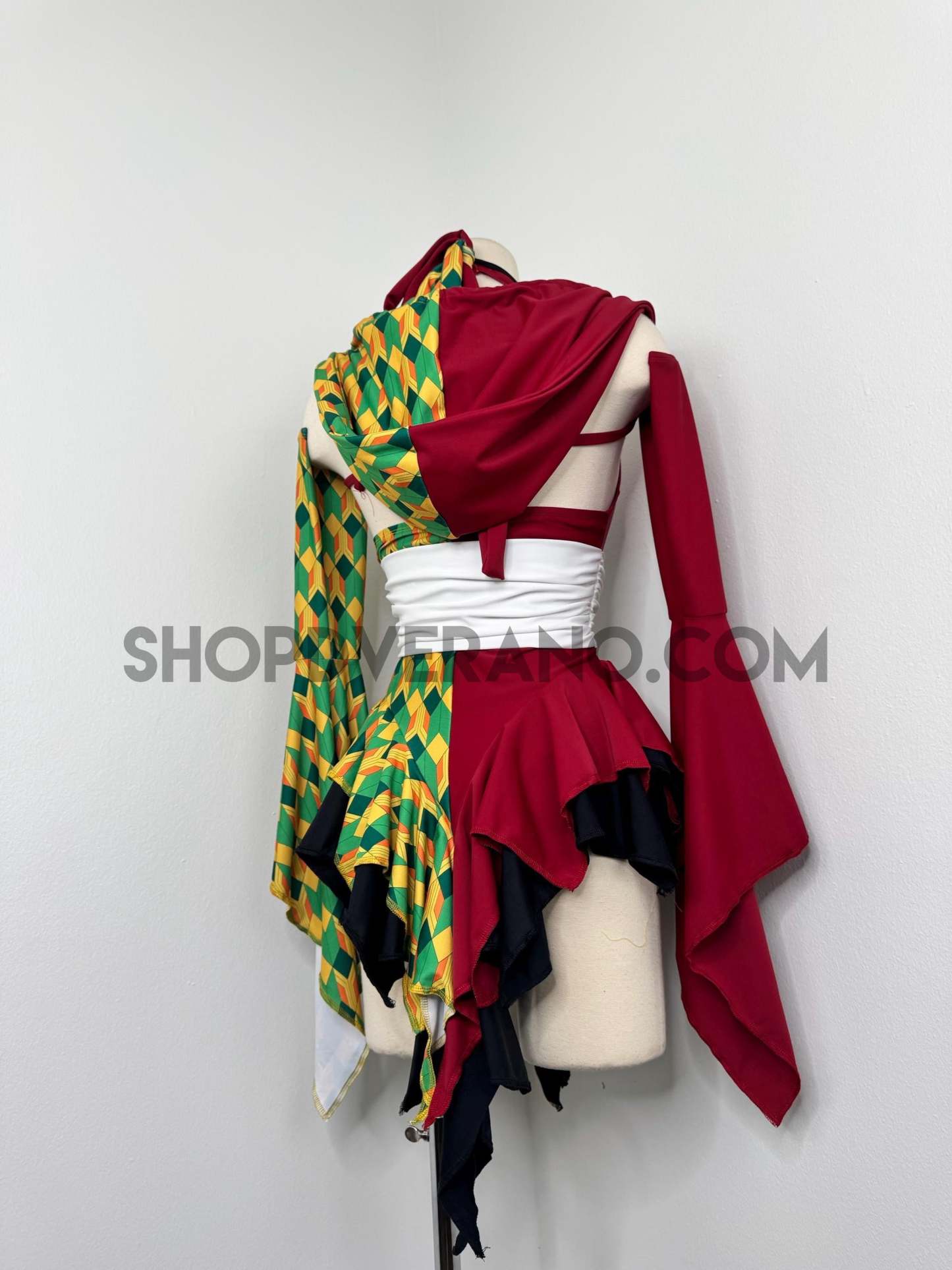 A dramatic fairy sleeve design completes the look; featuring one bold solid burgundy fairy sleeve and one with geometric print. The optional hoodie adds a mysterious, warrior inspired edge, giving the design an elevated and commanding presence.