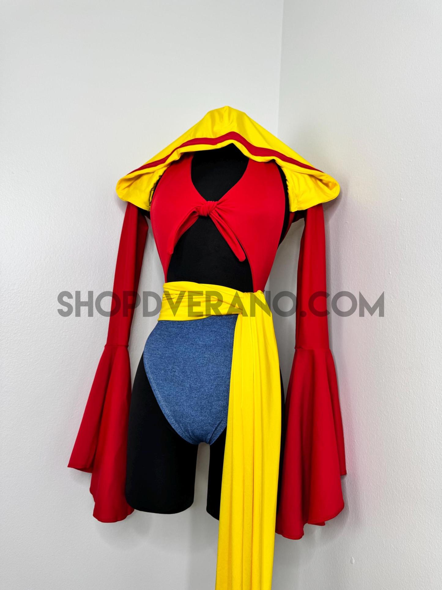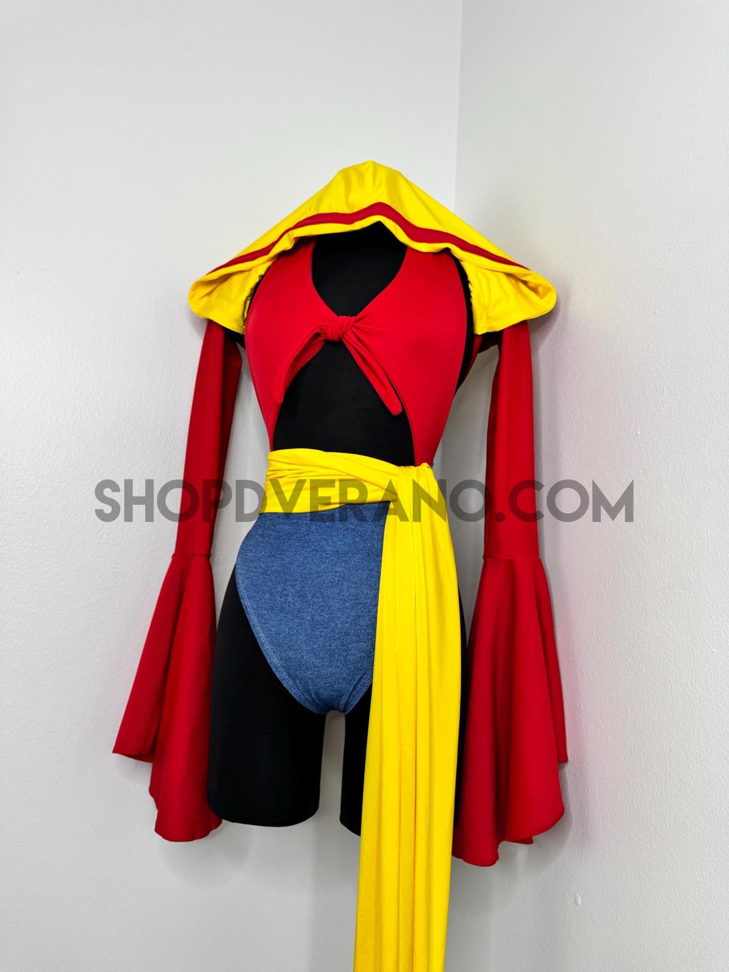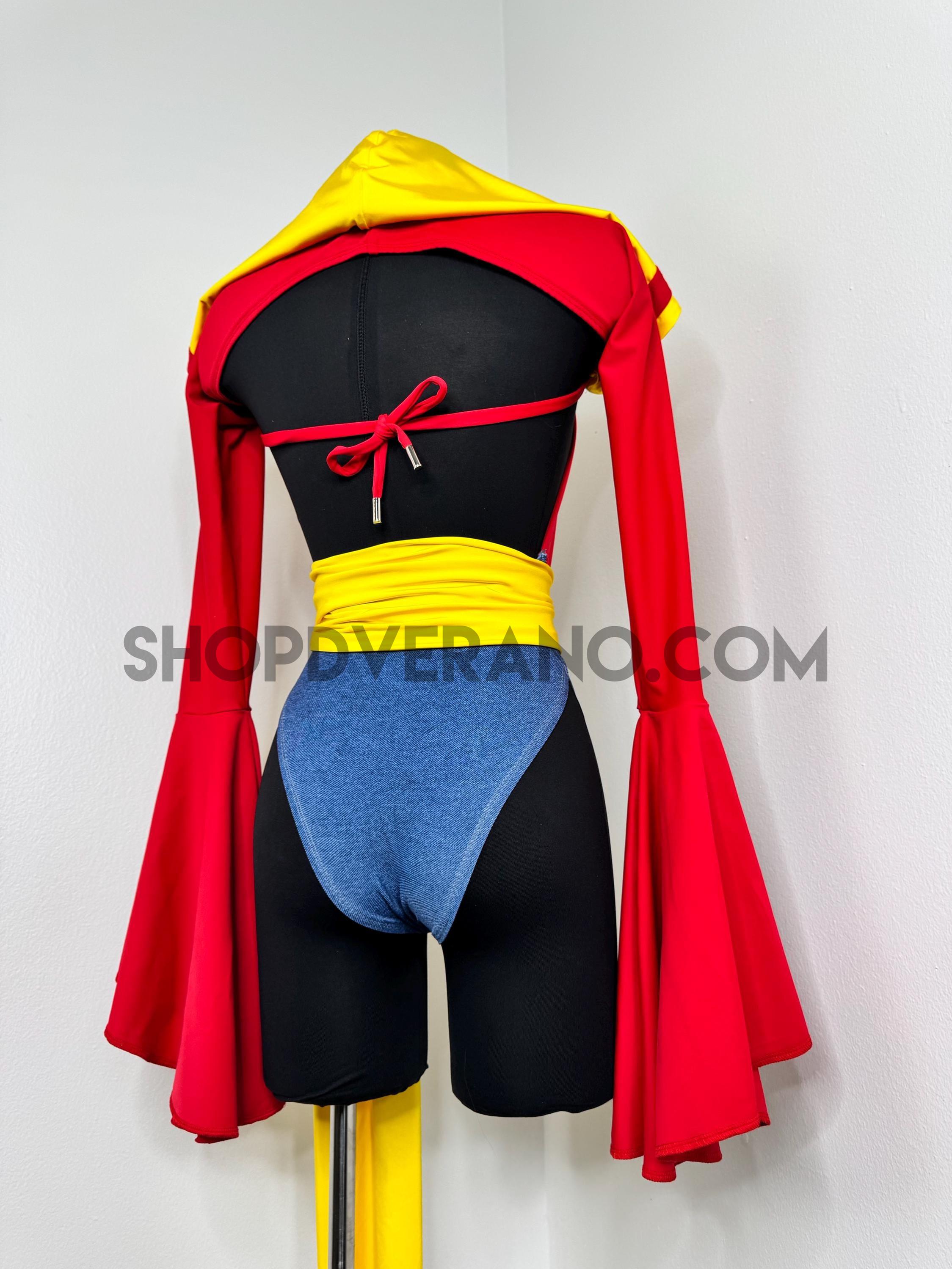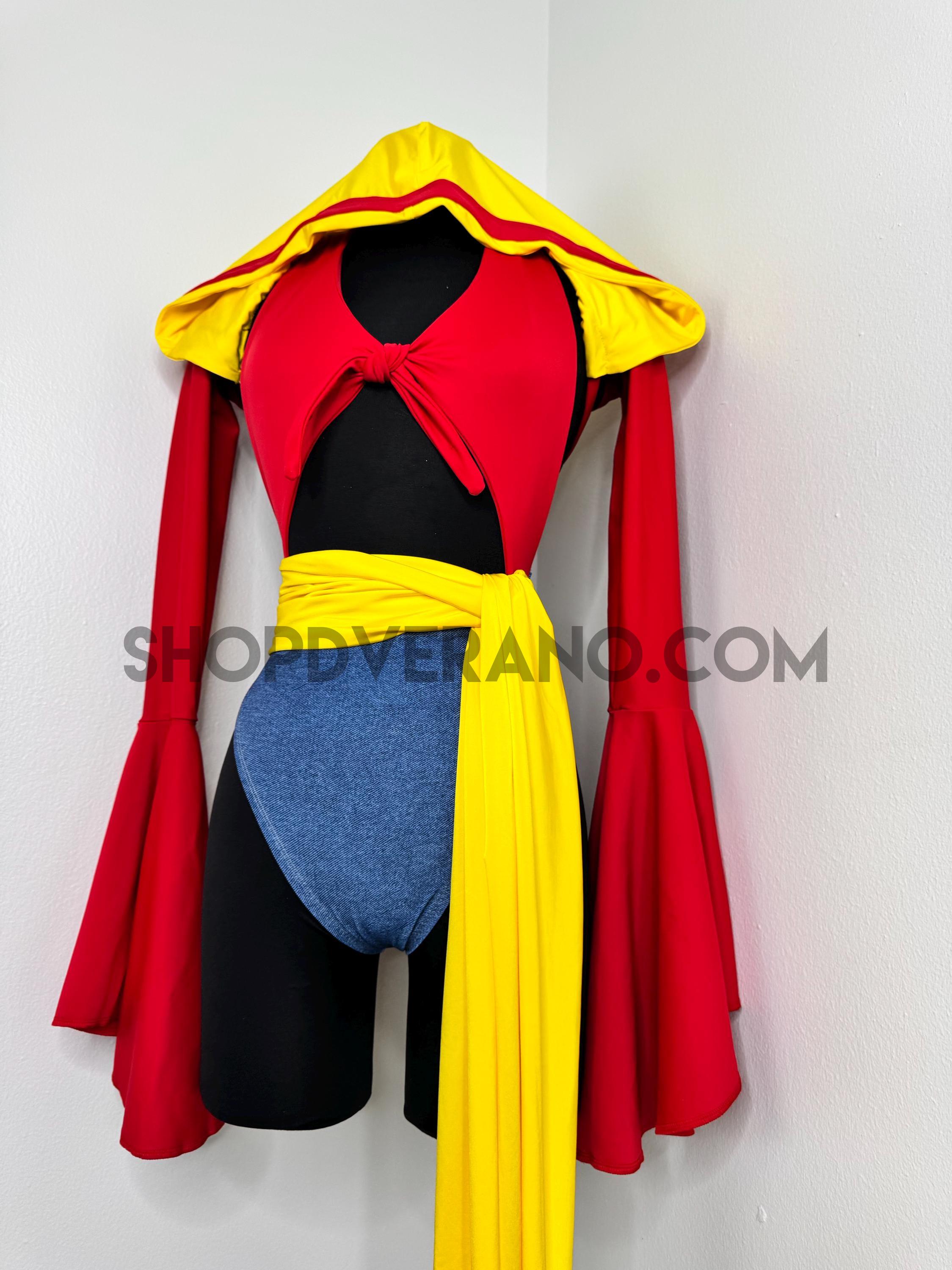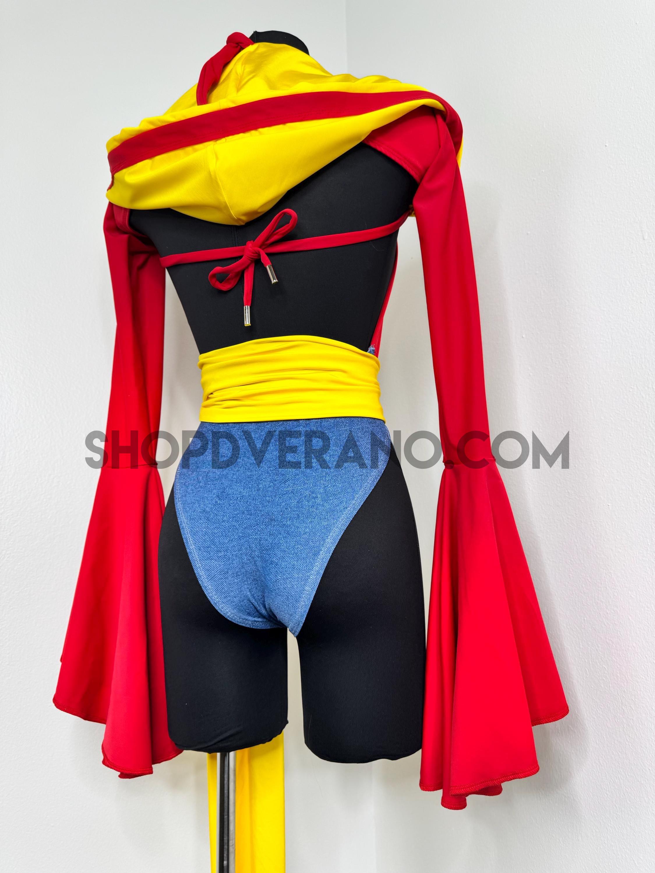 The halter style bodysuit ties at the back for an adjustable, secure fit, allowing total freedom of movement. A contrasting yellow sash style belt cinches the waist, adding definition while enhancing the playful silhouette. The look is finished with bolero style bell sleeves that add dramatic flow and movement, paired with a fully lined hoodie for versatile, layered styling.
