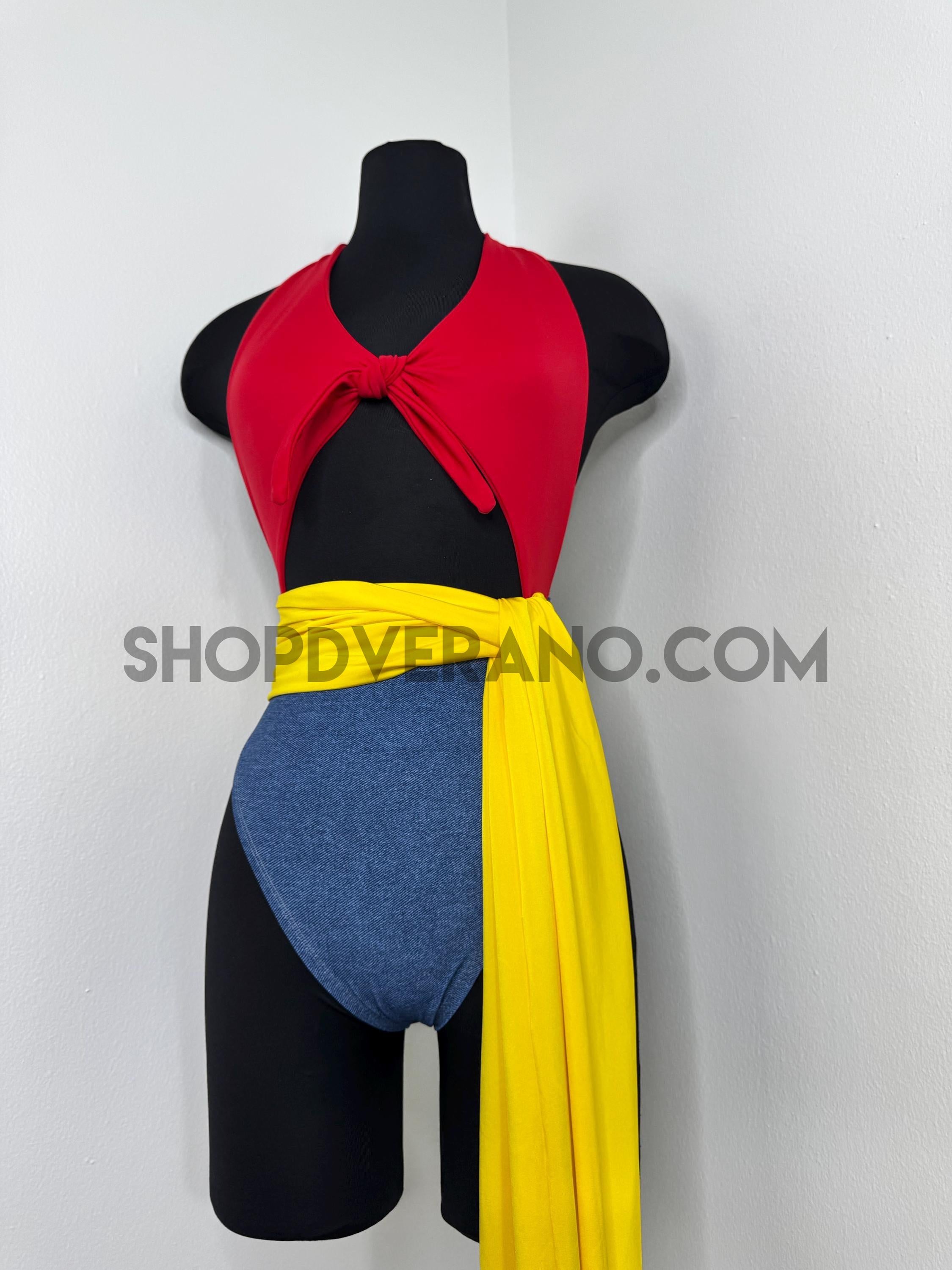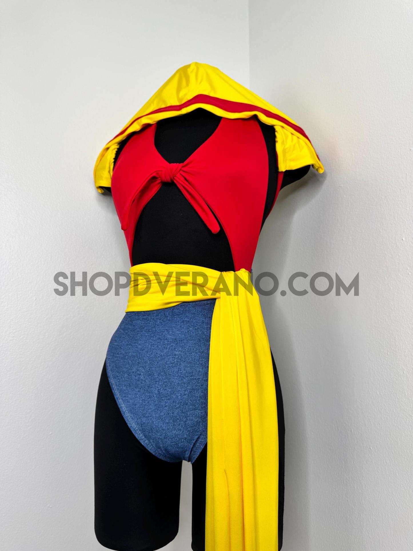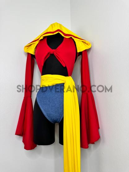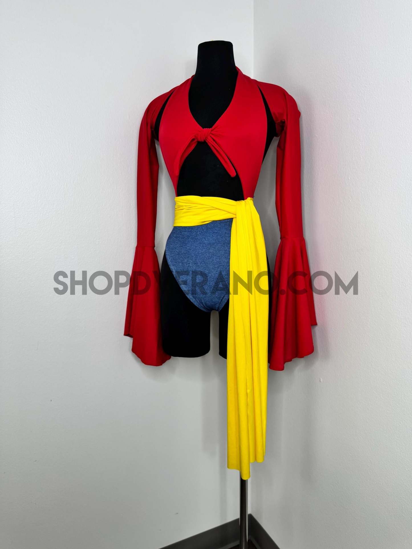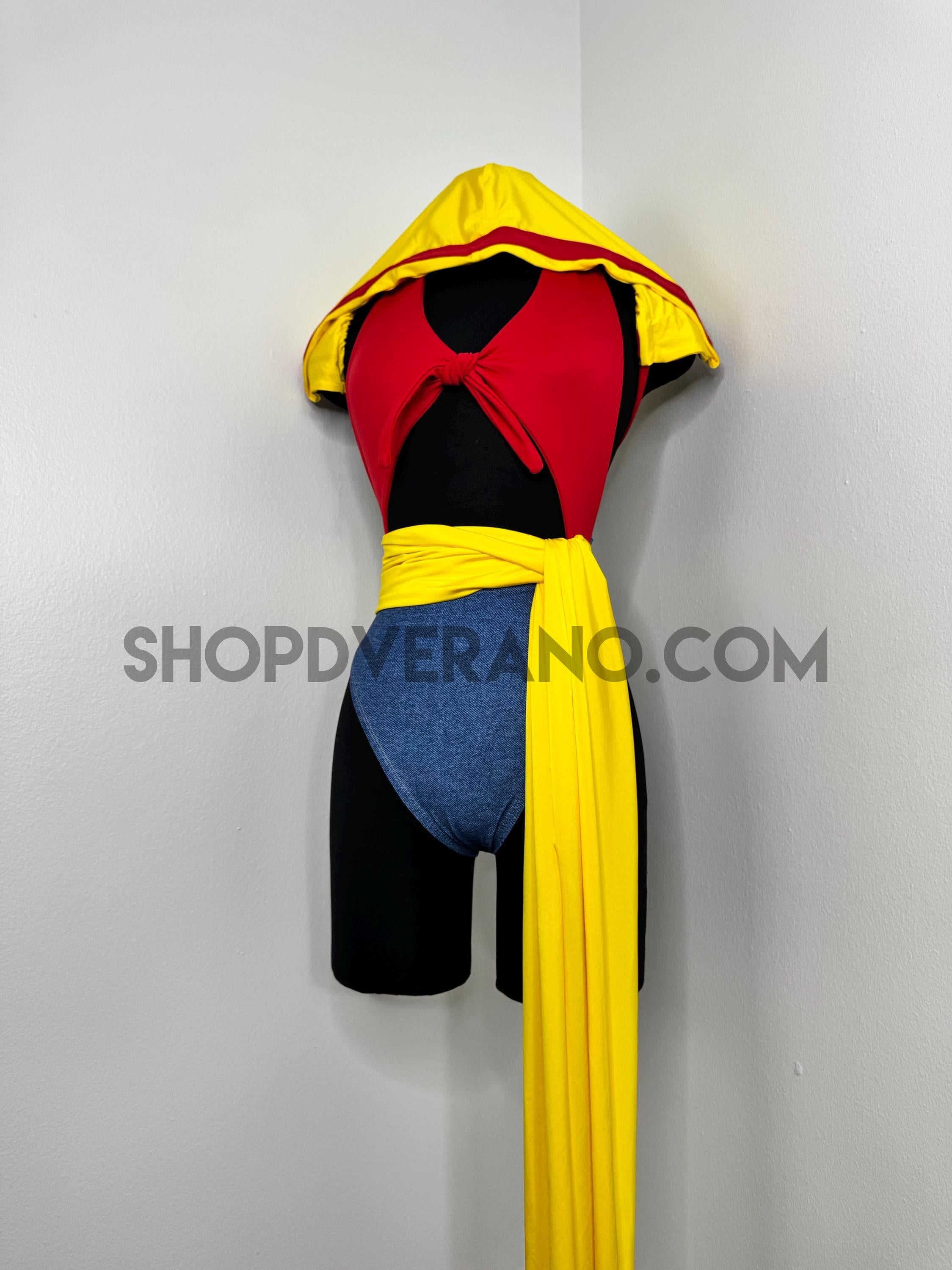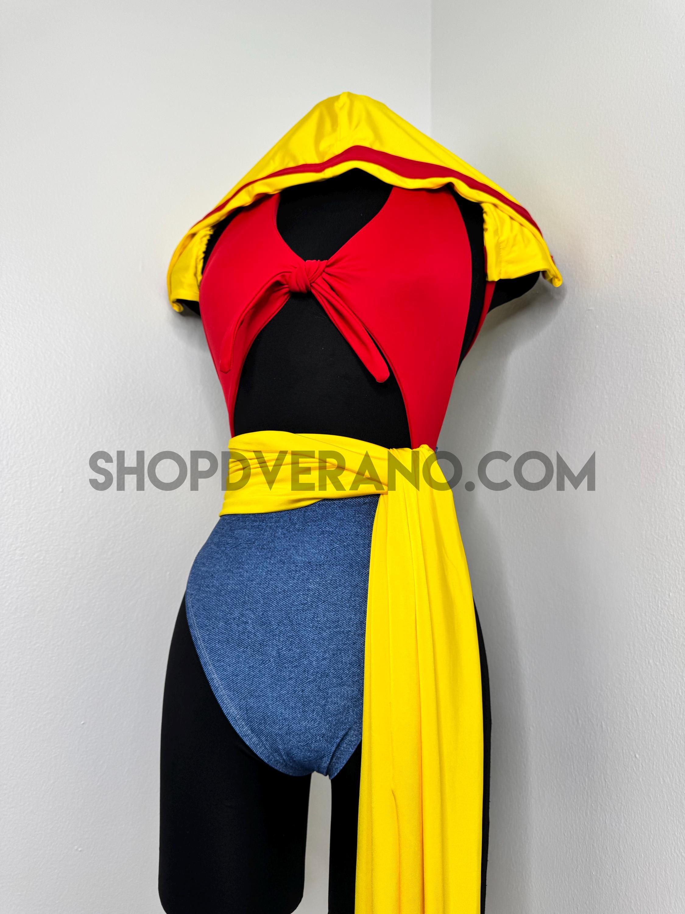 The halter style bodysuit ties at the back for an adjustable, secure fit, allowing total freedom of movement. A contrasting yellow sash style belt cinches the waist, adding definition while enhancing the playful silhouette. The look is finished with bolero style bell sleeves that add dramatic flow and movement, paired with a fully lined hoodie for versatile, layered styling.