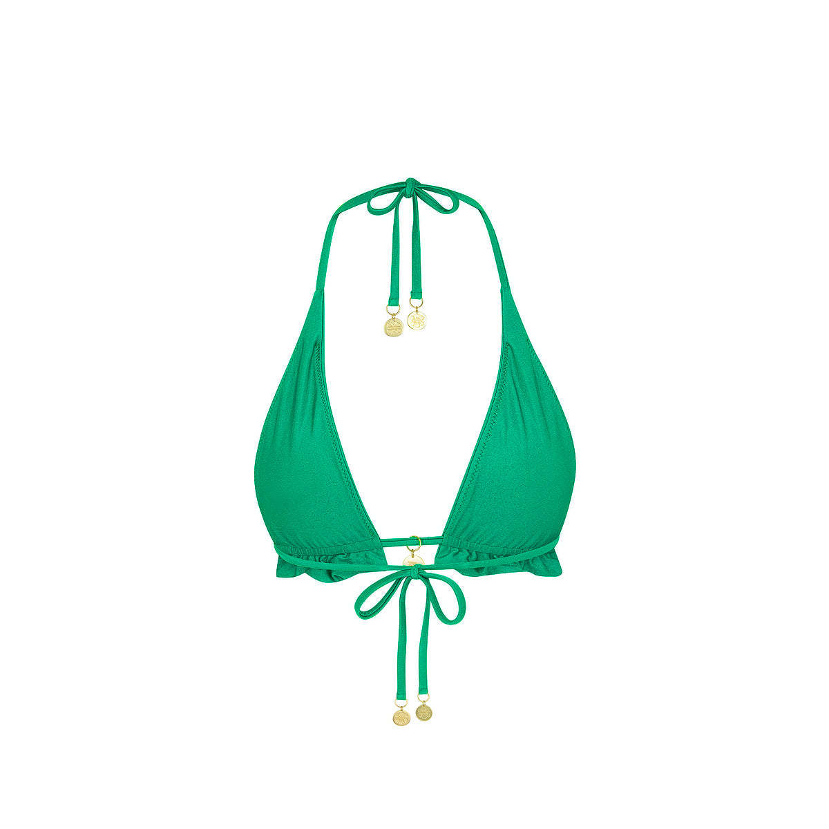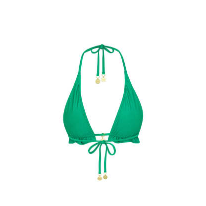 This halter bikini top is a timeless triangle style with a flattering, adjustable underbust frill ruched detailing. Perfect for those who love a secure yet minimal fit, it's a versatile staple for any occasion—simple, classic, and effortlessly chic!