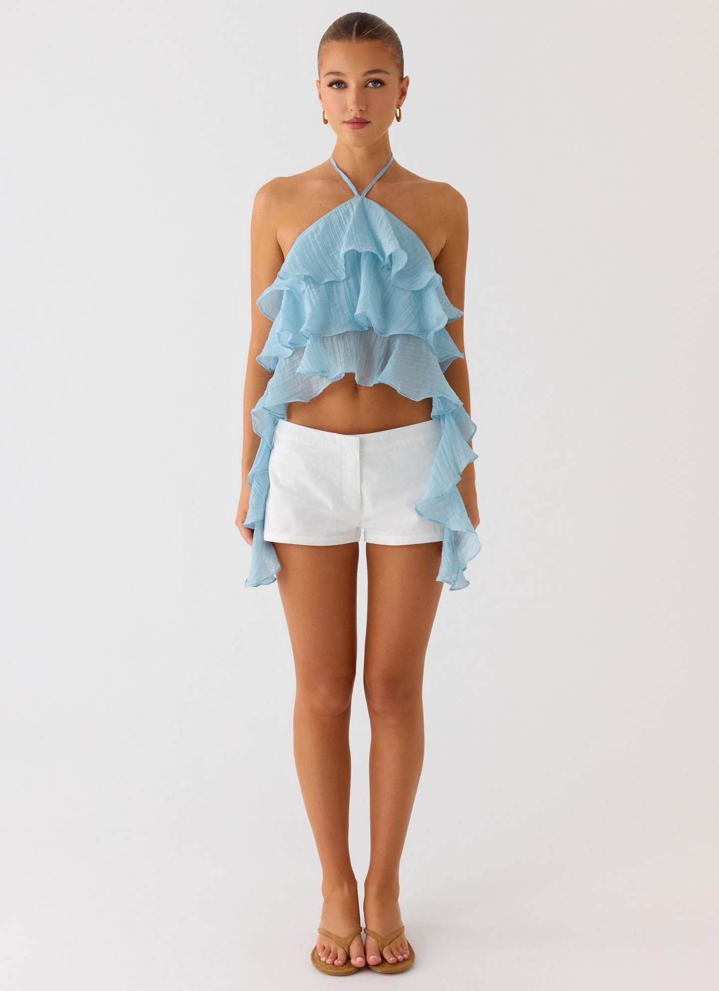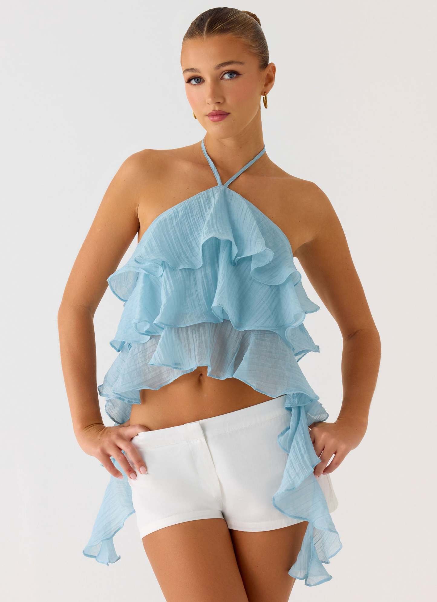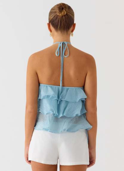 The Inna Frill Halter Top is a playful and flirty addition to your wardrobe. Featuring tiered ruffles and a low back, it pairs perfectly with skirts or shorts for a chic, summery look.