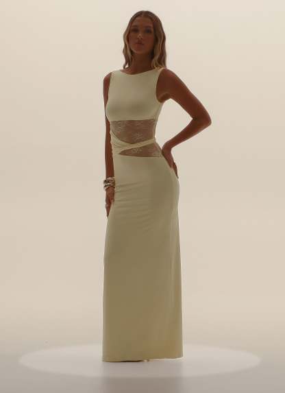 The Karma Maxi Dress is made for golden hour elevation and nights that demand unforgettable allure. Featuring a sophisticated rounded neckline and a sleek stretch jersey fit, this silhouette is artfully interrupted by a delicate semi-sheer lace waist and twisted waistband detailing. With a perfectly lined bodice and skirt, it balances comfort with a daring edge, making it the ultimate statement piece for sunset-to-after-dark glamour.