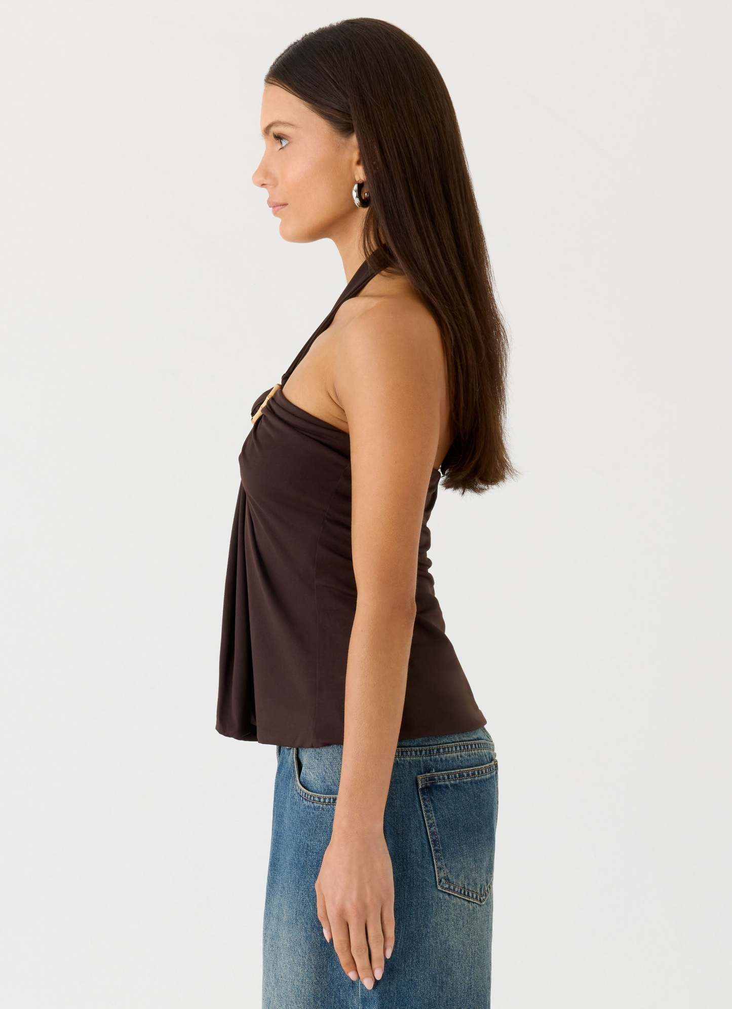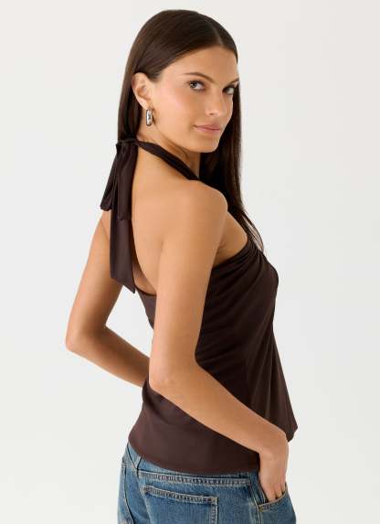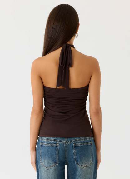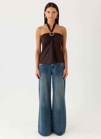 The Lorenza Halter Top is designed for breezy afternoons that linger into balmy nights. Featuring a ruched bust with wooden hardware detail and a halter neckline, this loose-fitting silhouette flows effortlessly over the body. Crafted for comfort and movement, it captures a relaxed yet elevated summer vibe.