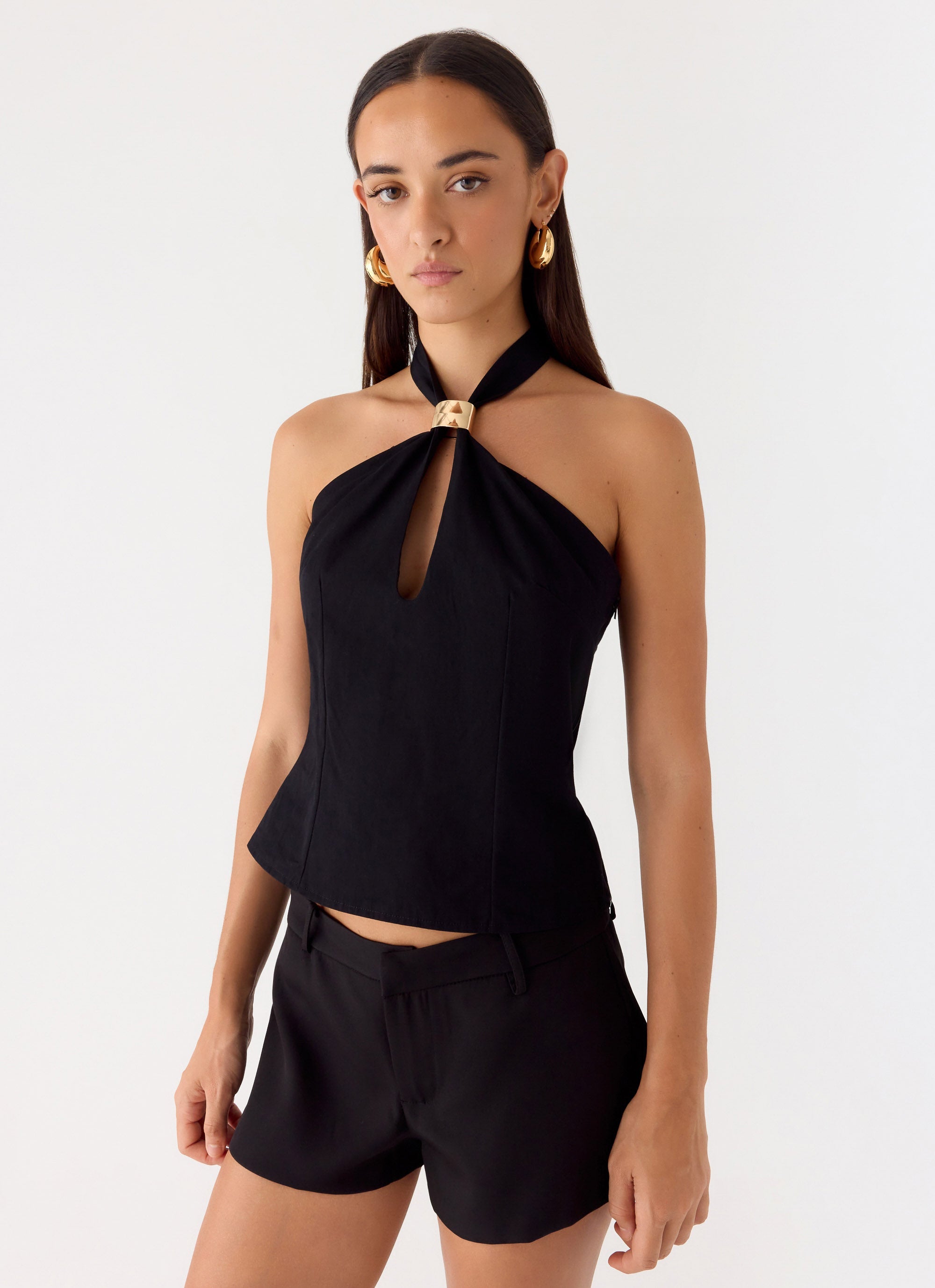 The Odetta Halter Top is made for elevated, statement-making moments. Featuring a halter neck strap and front keyhole cutout, this fully lined top is adorned with gold toned hardware for a subtle touch of glamour. Sleek, structured, and effortlessly chic, it’s designed to stand out on its own.