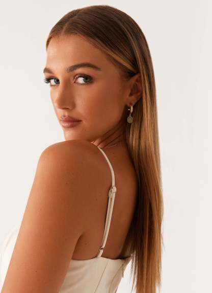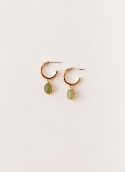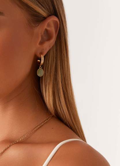 The Orielle Earrings are a striking and elegant accessory, featuring gold hardware that adds a touch of sophistication. The green detailing provides a pop of color, creating a vibrant yet refined look.