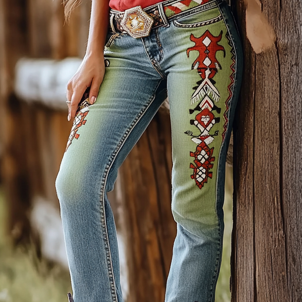 Western Vintage Style Faux Denim Aztec Print Women's Casual Pants