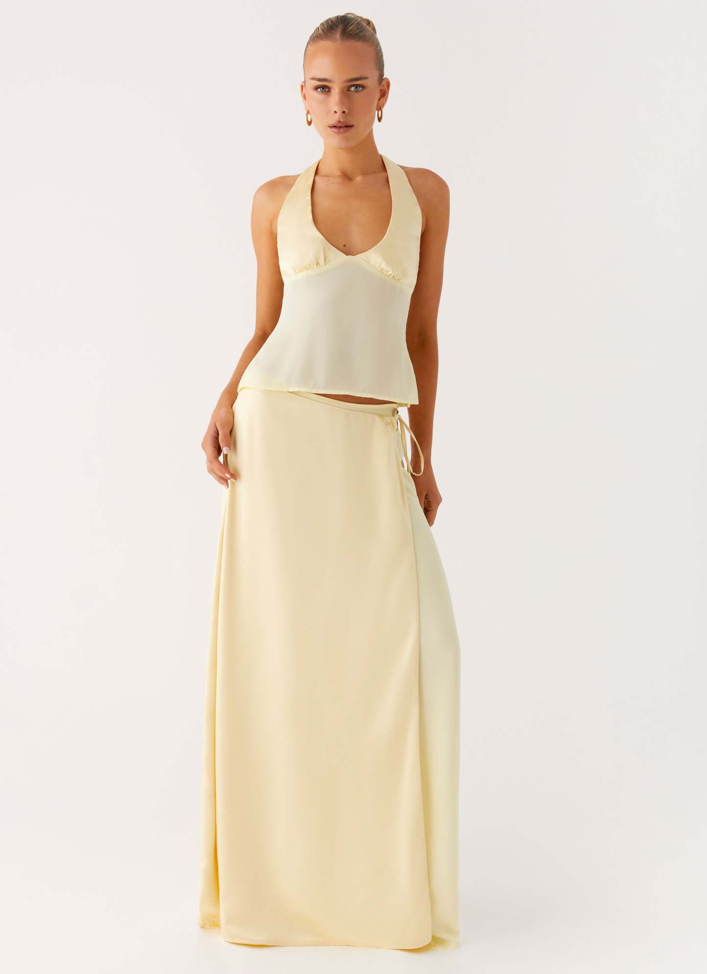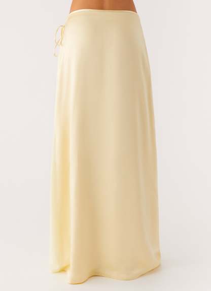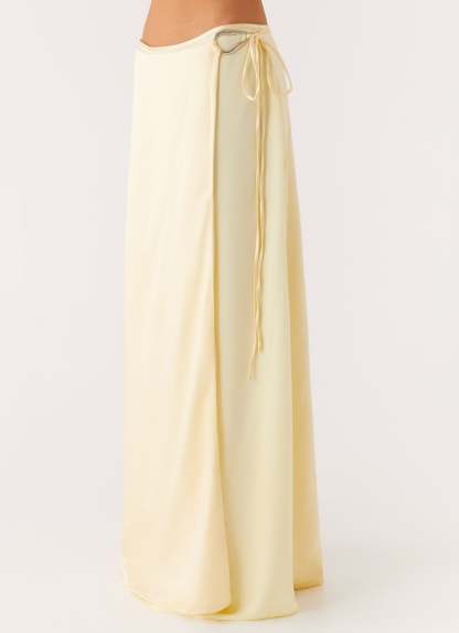 The Pollie Maxi Skirt is made for golden hour and midnight moves. Featuring a low rise with side tie and metal embellishment, this fully lined skirt is finished with a side hook and eye and invisible zipper for a flawless fit.