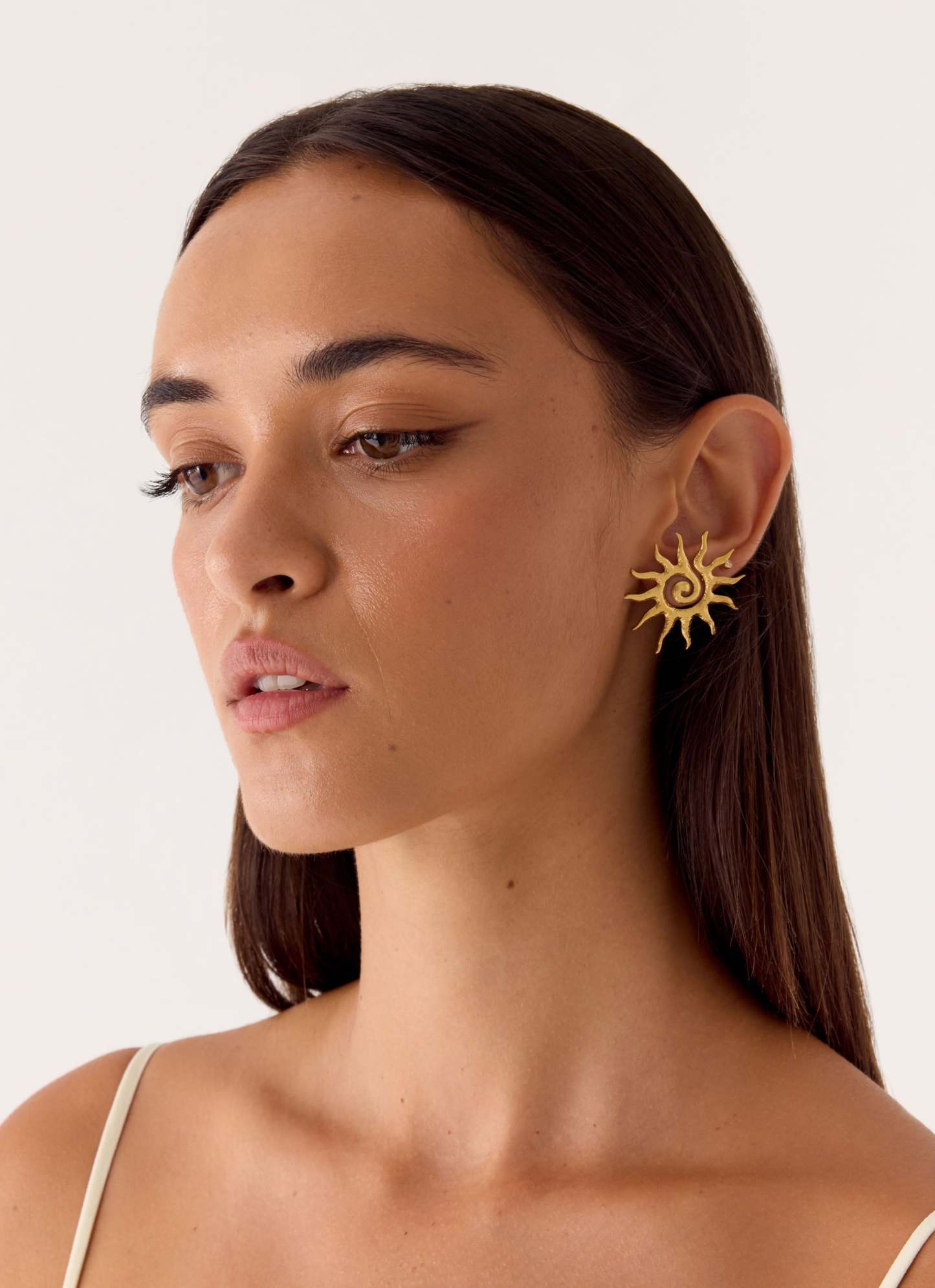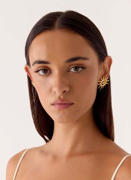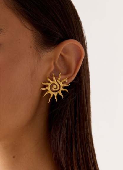 The Solaris Earrings echo the radiant energy of golden hour with their sun spiral design. Crafted to catch the light with every movement, these earrings bring a warm, editorial glow to any look. Sleek and sculptural, they’re the perfect complement to effortless summer nights and sunlit days.