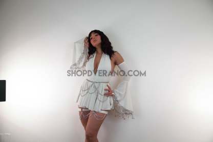 The silhouette is dreamy and flattering, with a plunging neckline and soft drape that catches the light at every angle — perfect for festivals, photoshoots, and stand-out holiday looks. The front waistband features a ruched detail to create a snatched, body-accentuating fit.