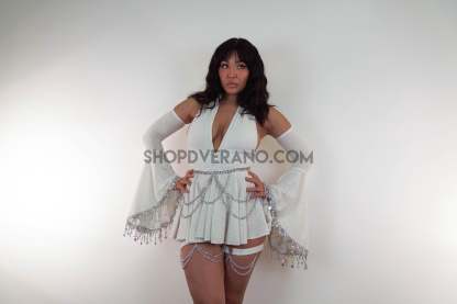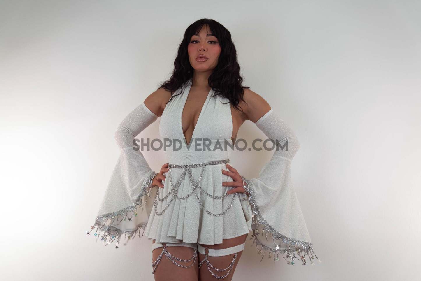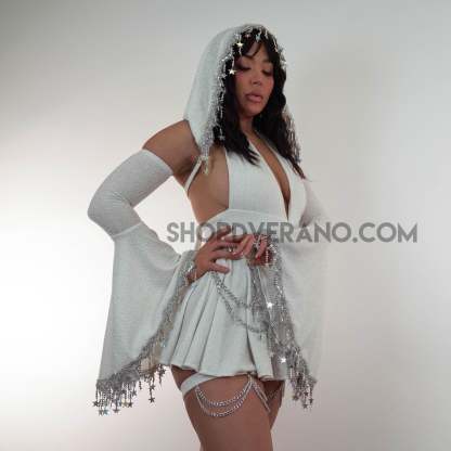 Both the shimmering hood and dramatic bell sleeves are adorned with holographic star trim, giving the entire look a magical, celestial finish. Complete the outfit with the removable, adjustable cascading chain belt that drapes beautifully at the front, plus matching stretchy cascading chain leg straps for a secure, comfortable fit.