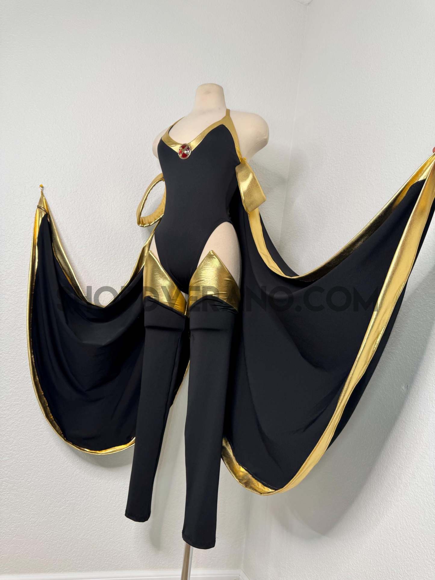 The bodysuit features a gold trim neckline and a striking red gem brooch at the chest, with a tie back neck strap for an adjustable fit. Two dramatic, detachable cape panels flow from the shoulders, edged in metallic gold spandex and anchored by gold wrist cuffs that hook to the cape, while the other end attaches seamlessly to the neck strap for a powerful, and adjustable silhouette.