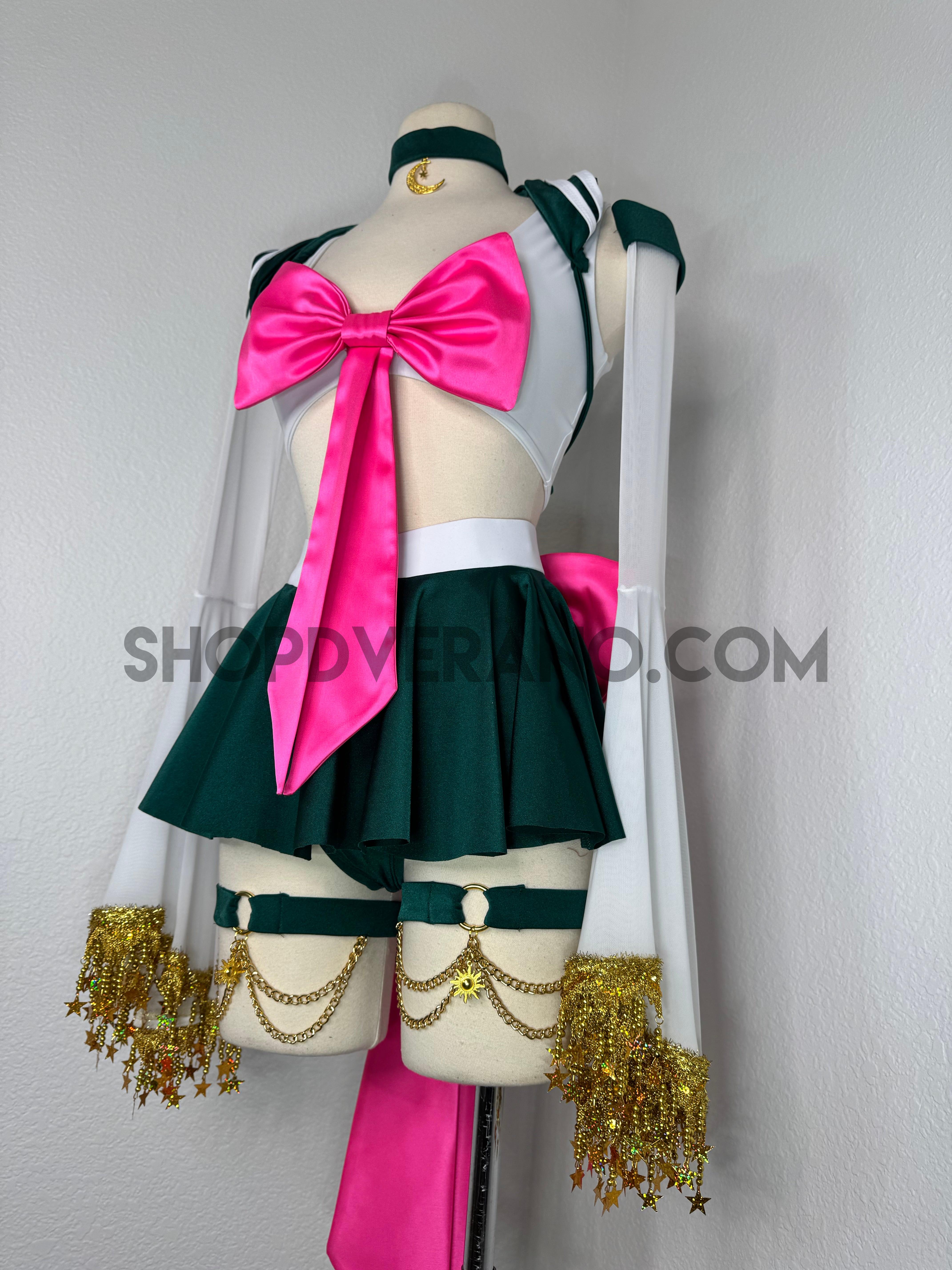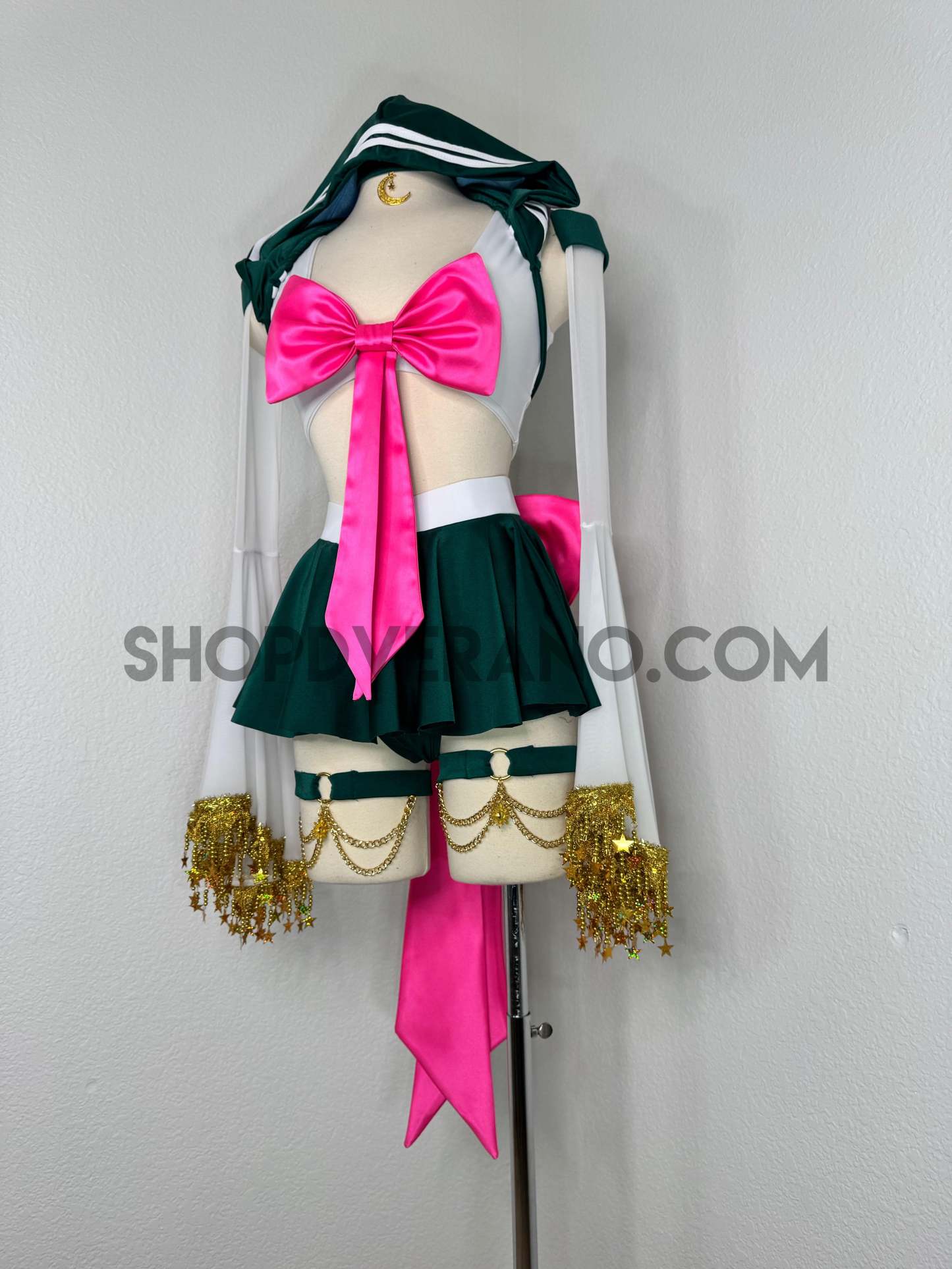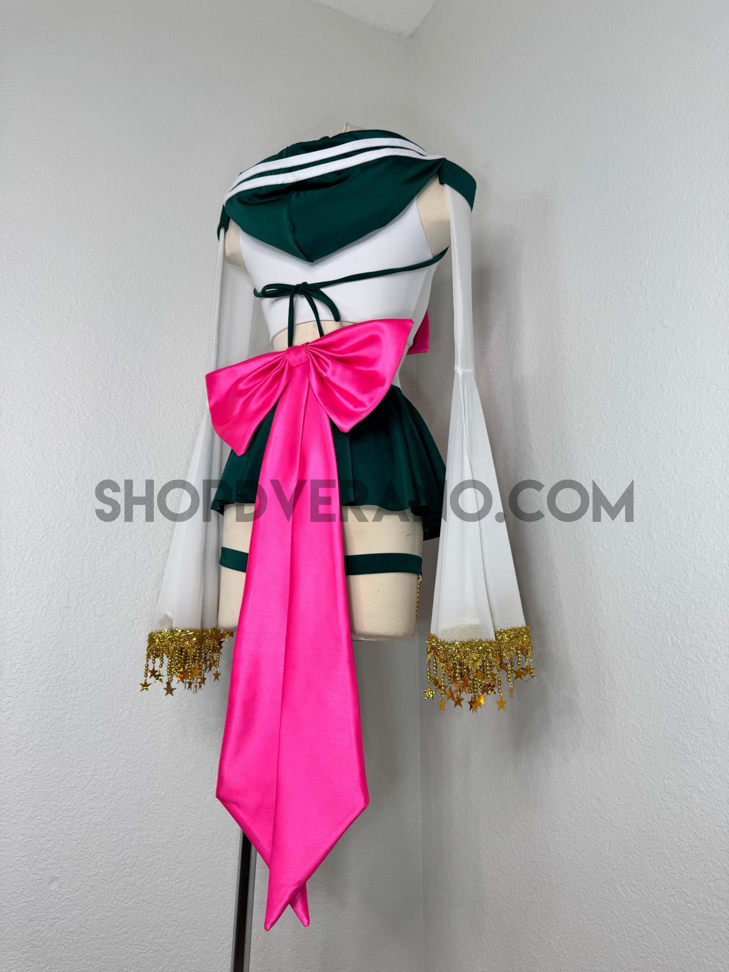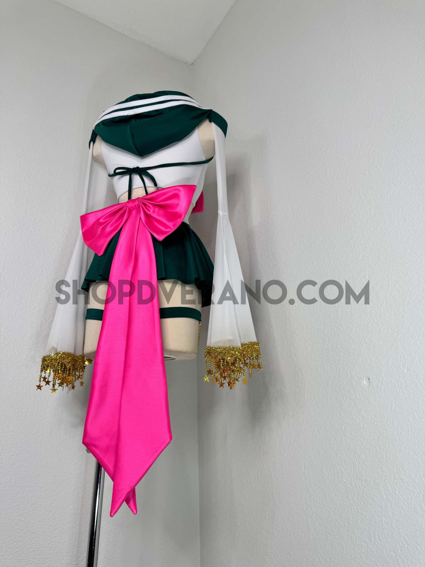 This unique ensemble features a mini skirt paired with a white crop top adorned with a removable bow. The set includes dramatic detachable sleeves in coordinating colors, finished with golden star fringe around the bell cuffs for an elegant, flowing silhouette and a distinctive celestial touch. The set also includes matching leg straps embellished with delicate gold chains and sun charms for the perfect finishing accent.