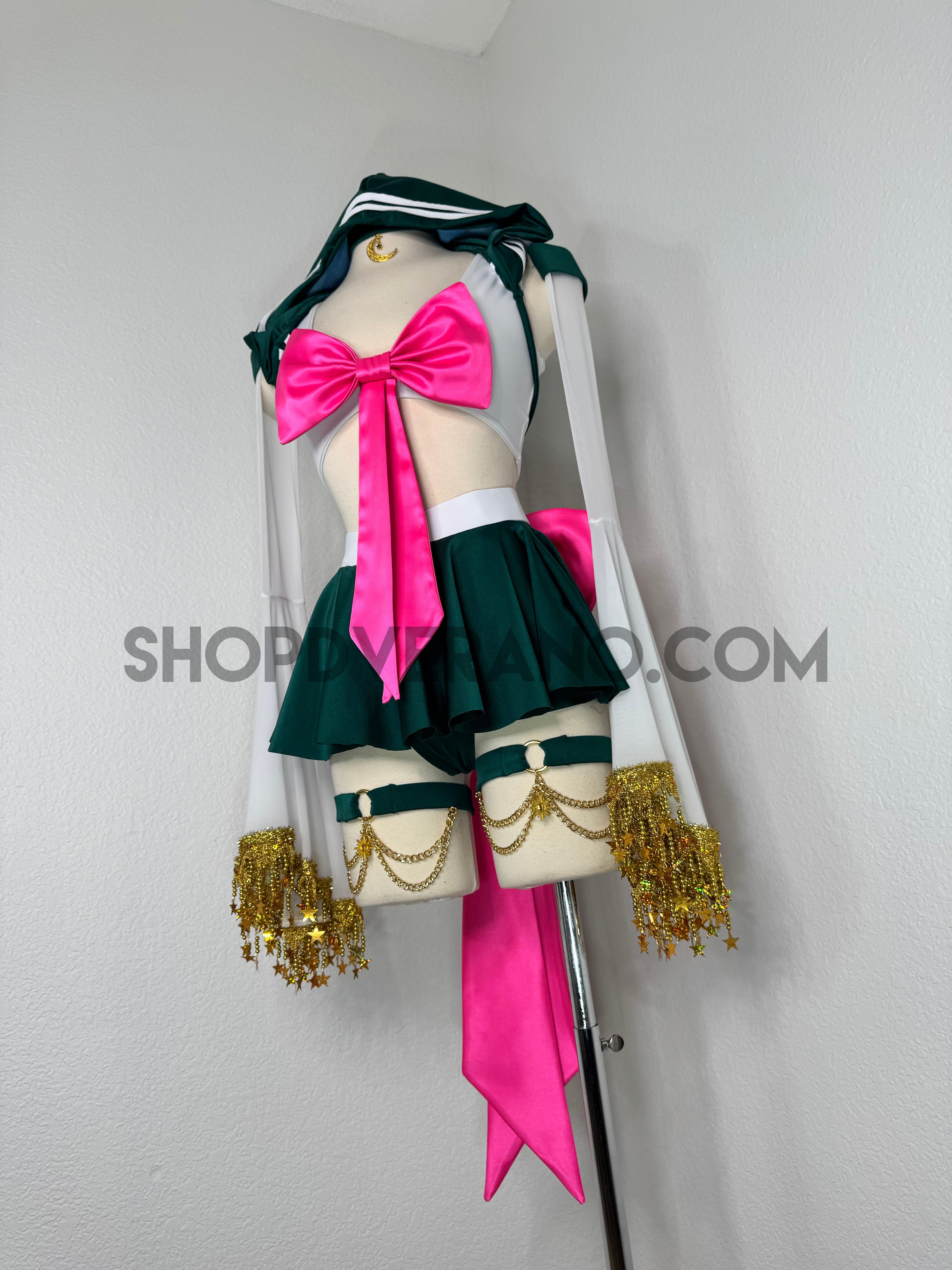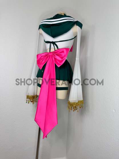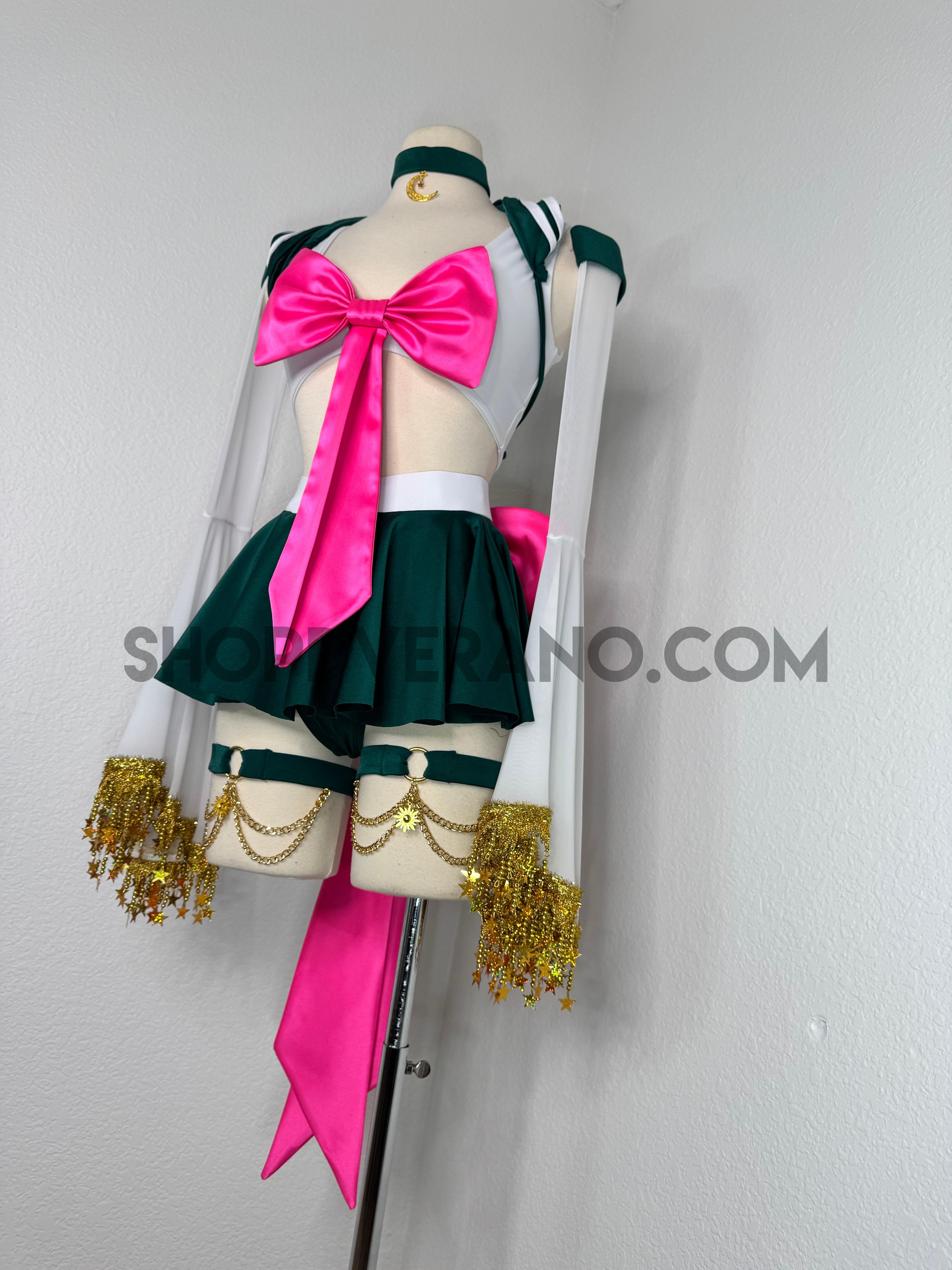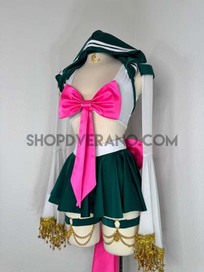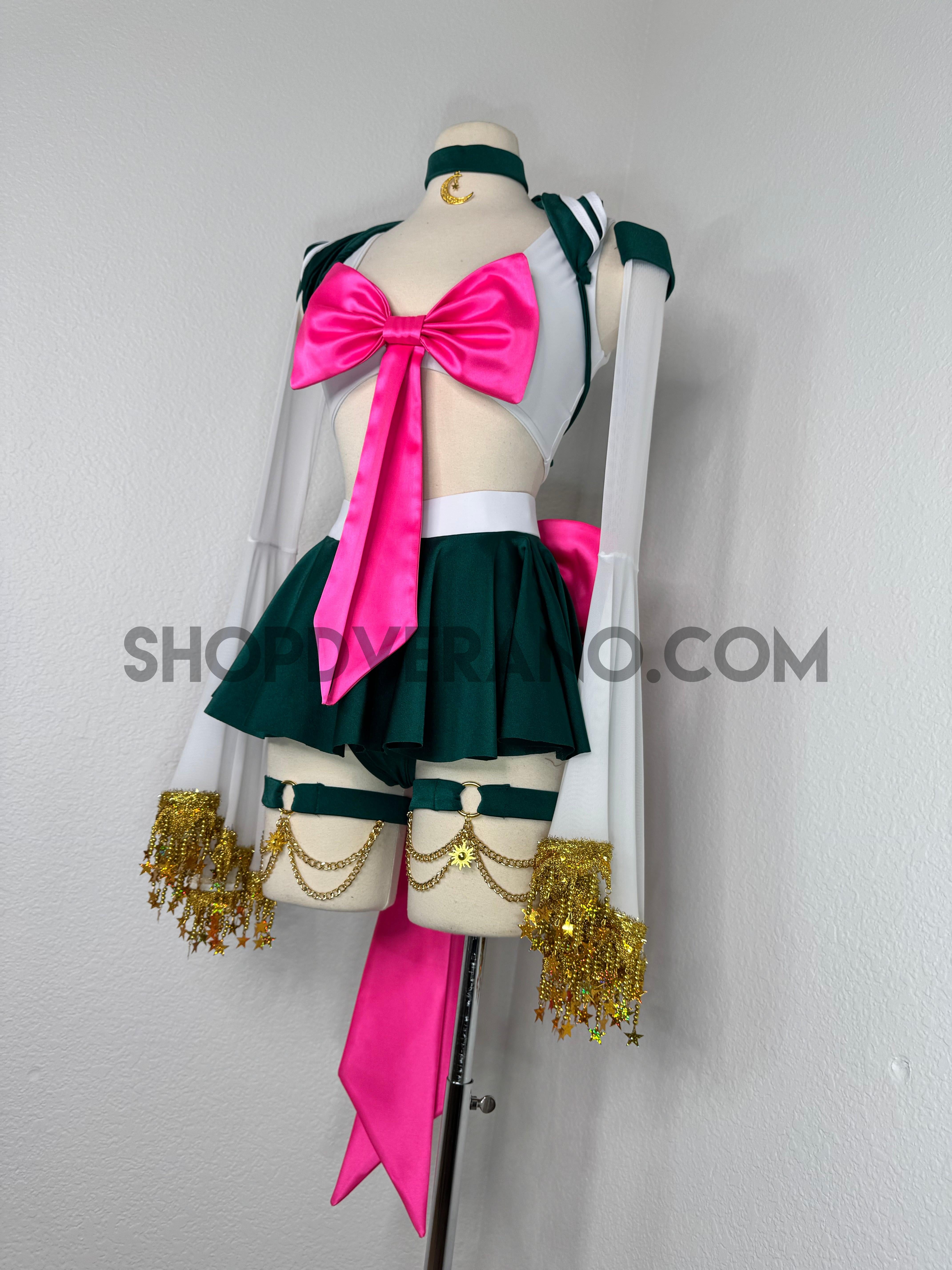 This unique ensemble features a mini skirt paired with a white crop top adorned with a removable bow. The set includes dramatic detachable sleeves in coordinating colors, finished with golden star fringe around the bell cuffs for an elegant, flowing silhouette and a distinctive celestial touch. The set also includes matching leg straps embellished with delicate gold chains and sun charms for the perfect finishing accent.