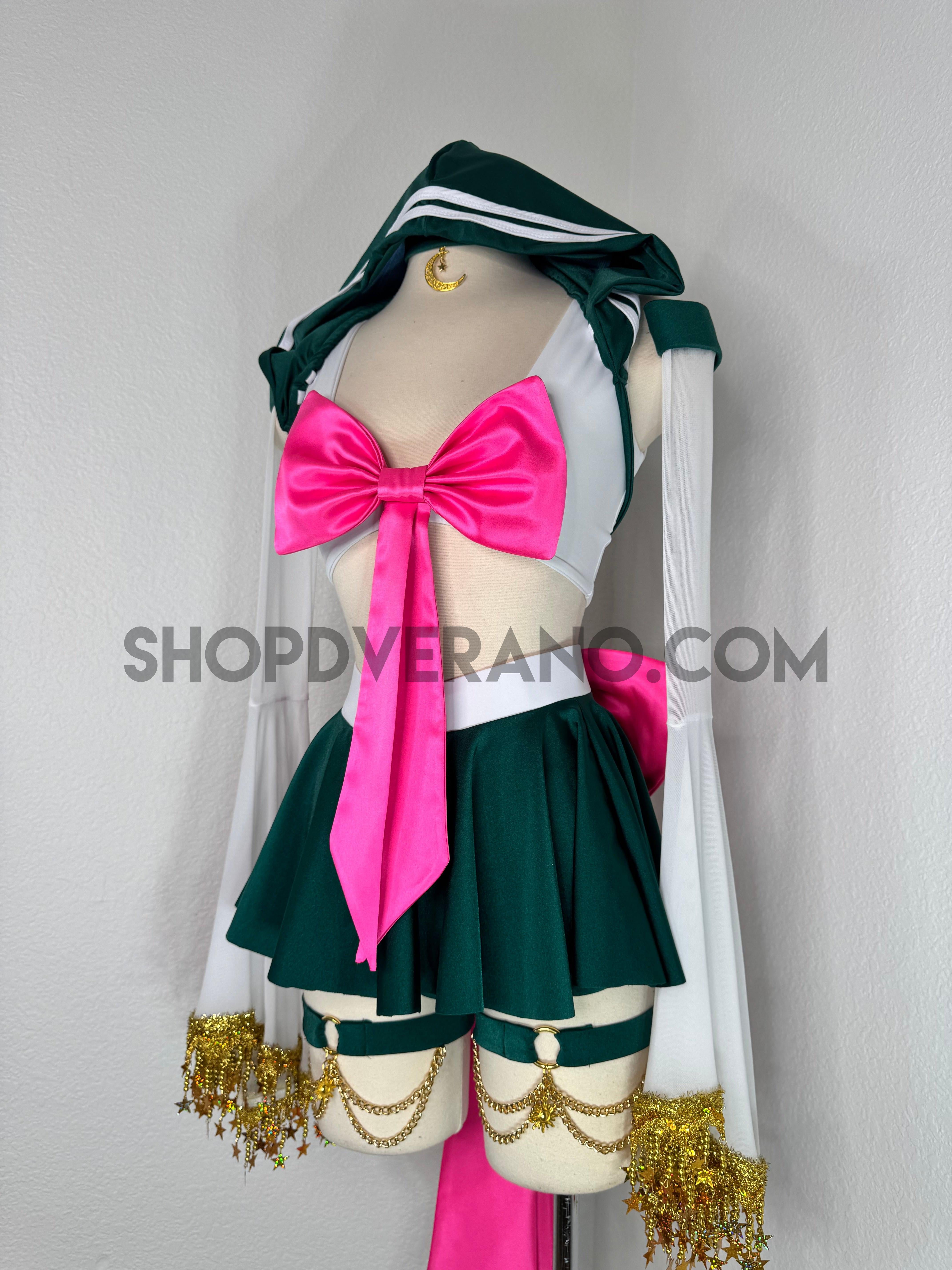 The look is completed with unique hoodie with white stripe detailing, an oversized back bow with a cascading touch, and a matching crescent moon choker—perfect for channeling your inner heroine, whether you’re dancing under festival lights or stepping into character at your next convention.