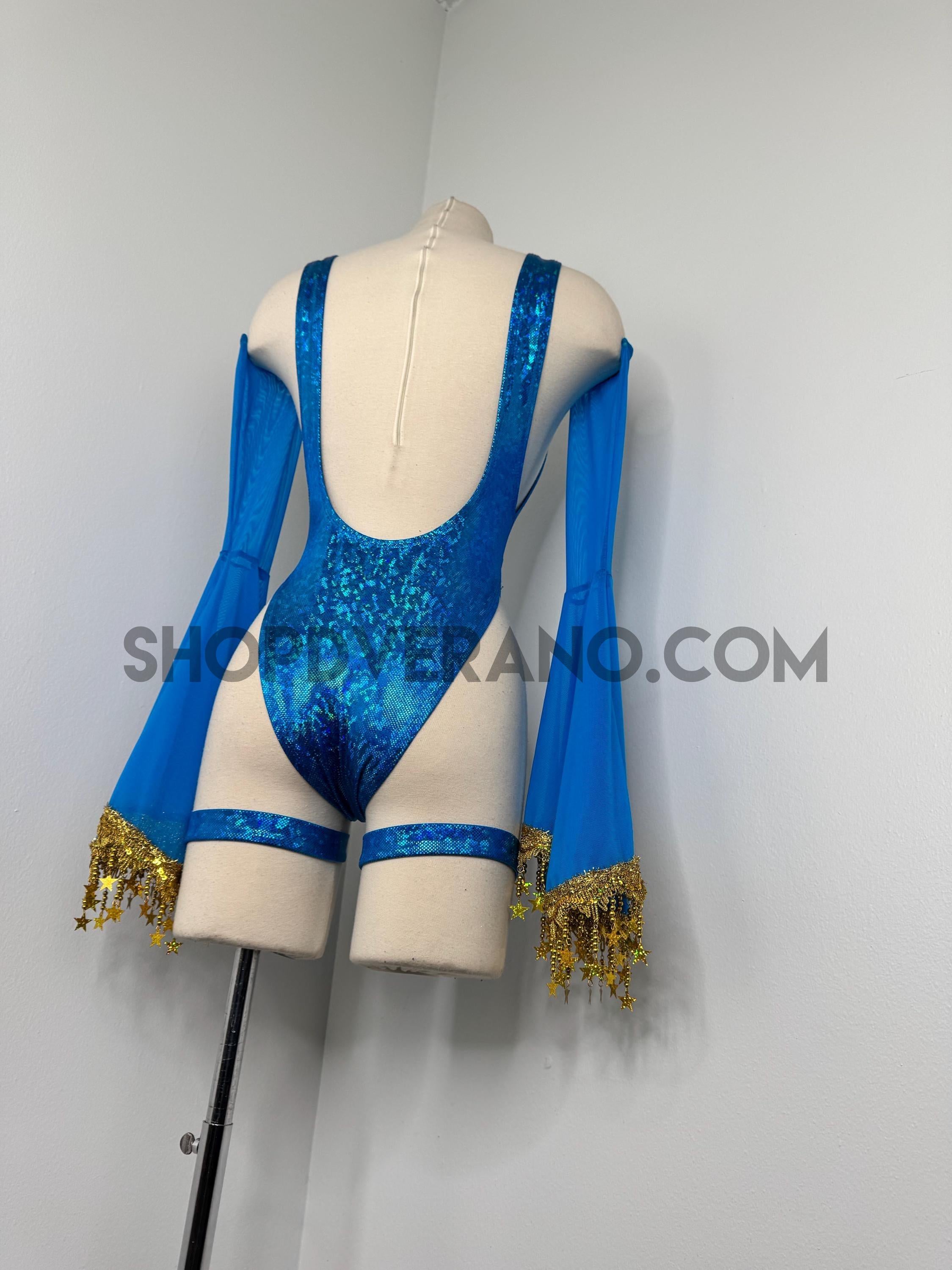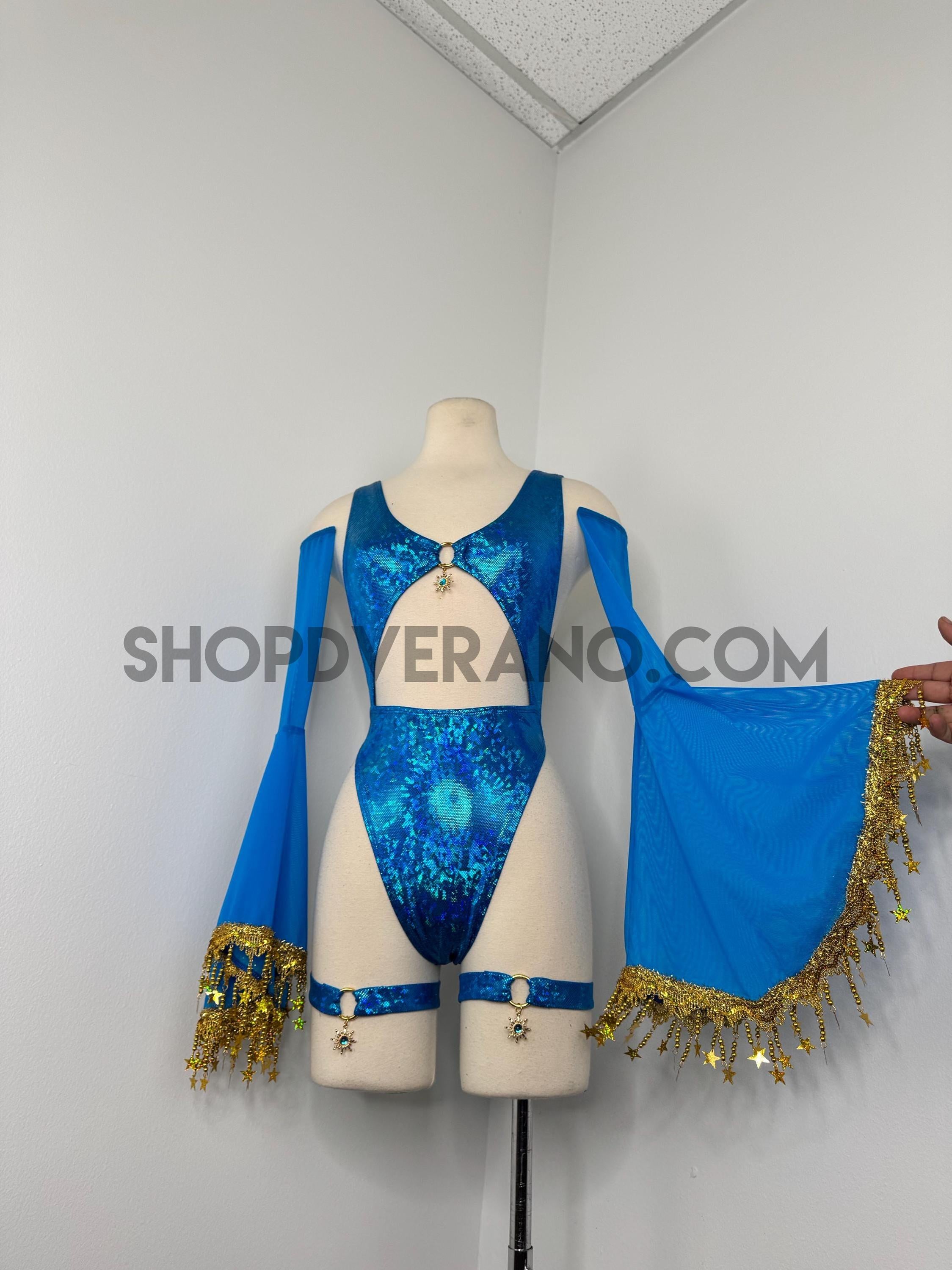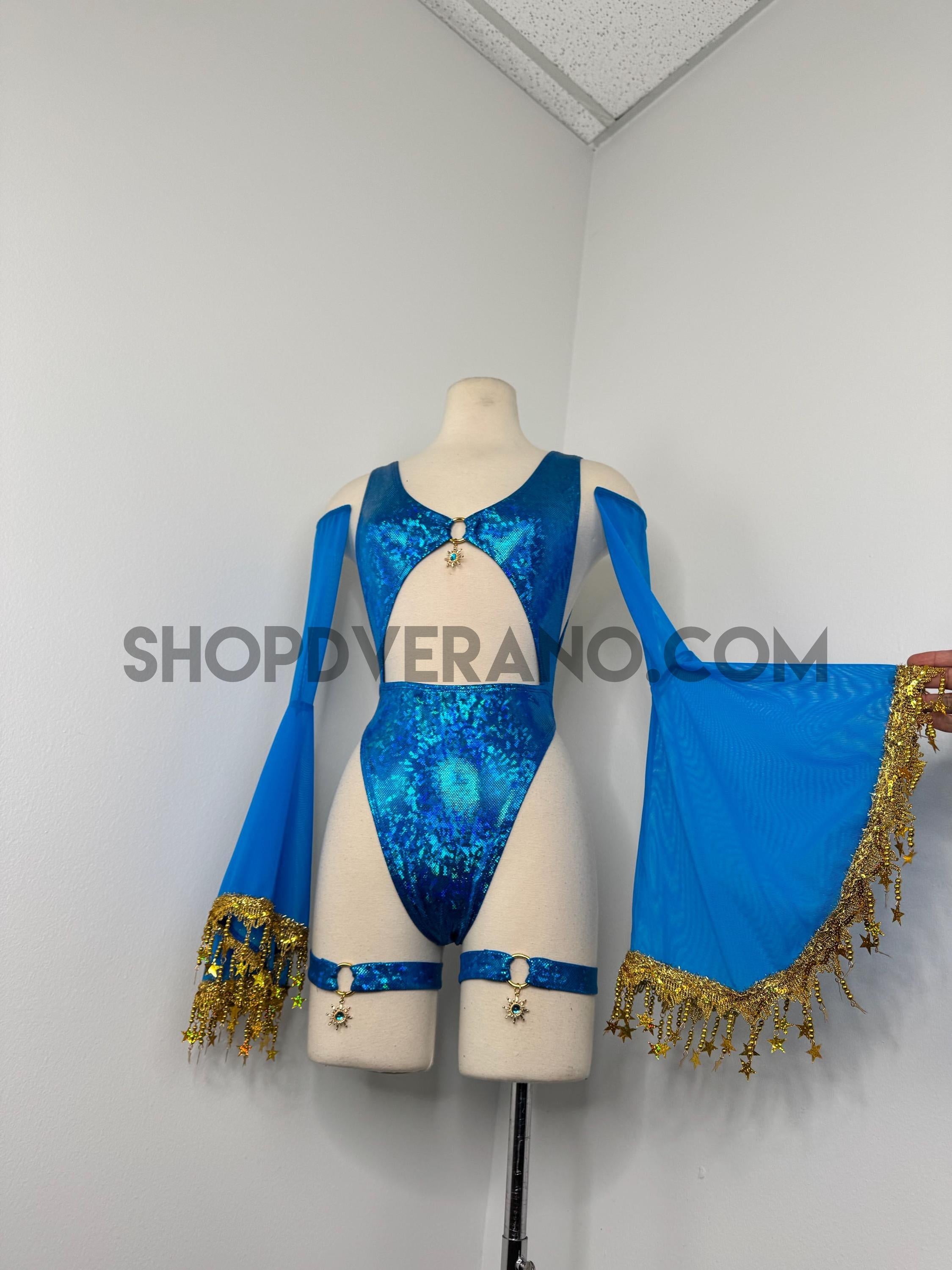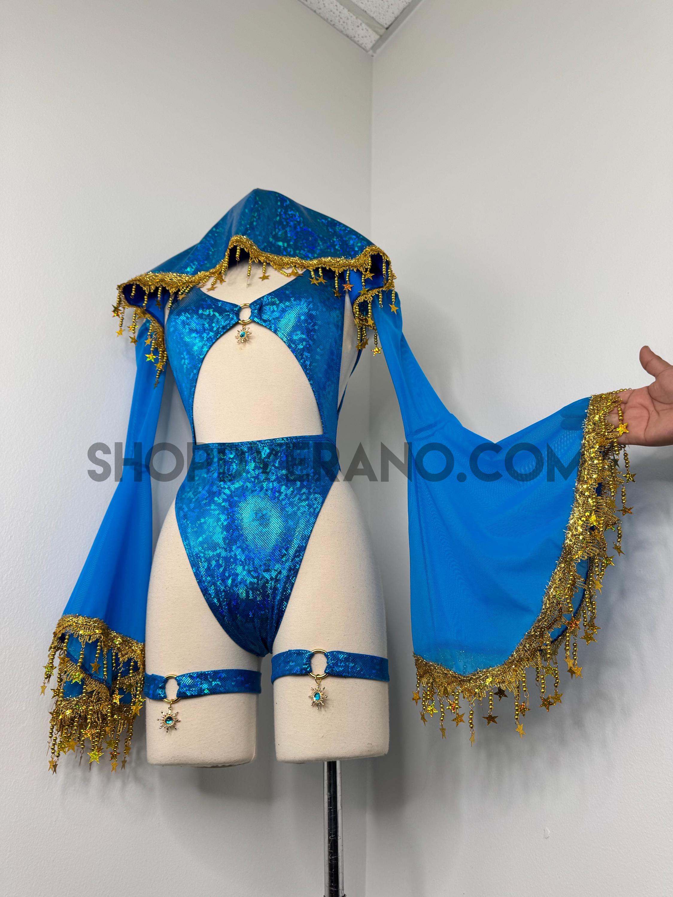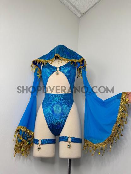 The look is elevated with a matching hooded bolero featuring star trim, adding celestial drama and movement, while flowing sleeves create an ethereal, siren-inspired silhouette. Elastic legs straps finish the look with a bold, statement touch that ties the entire set together.