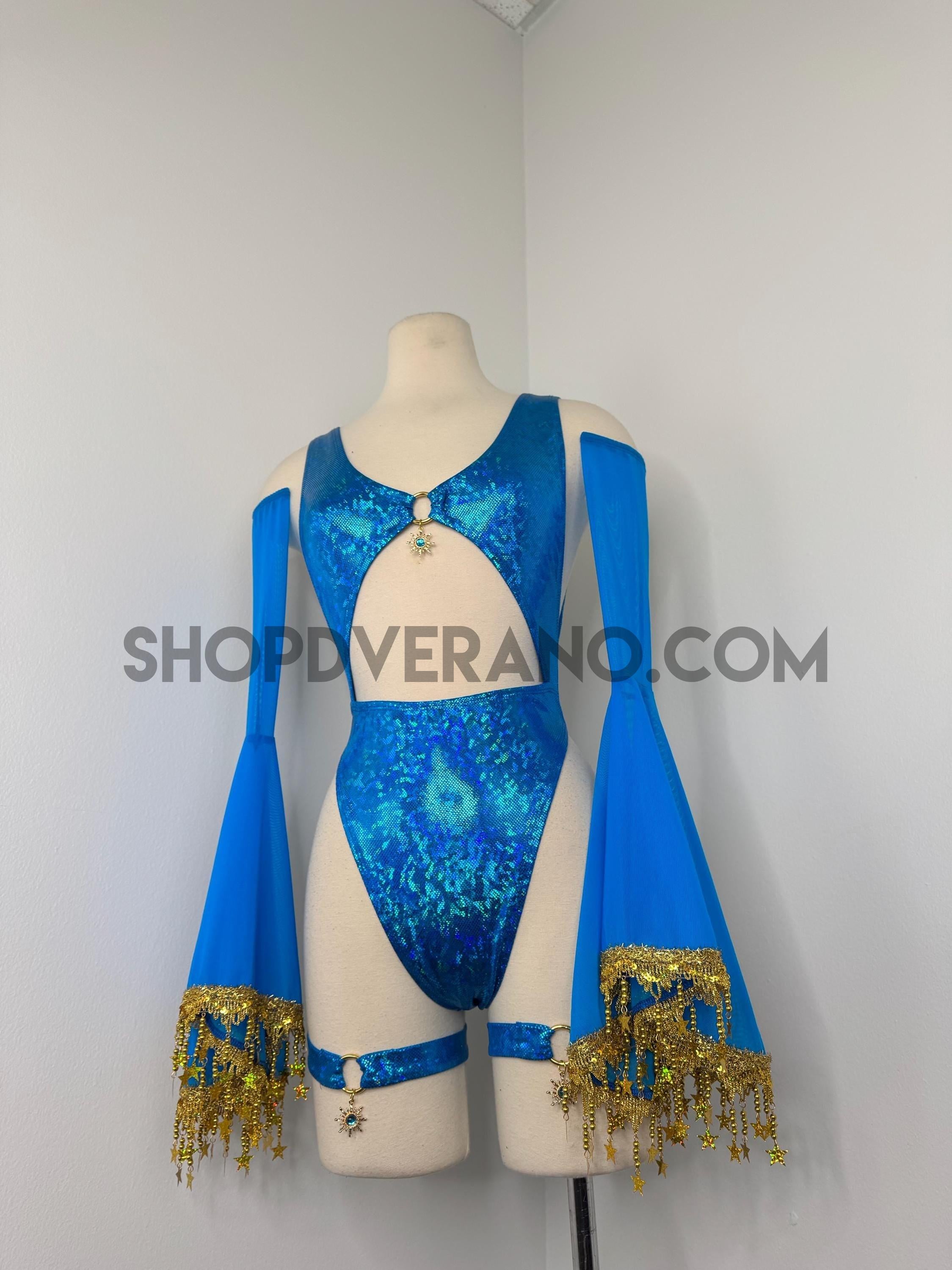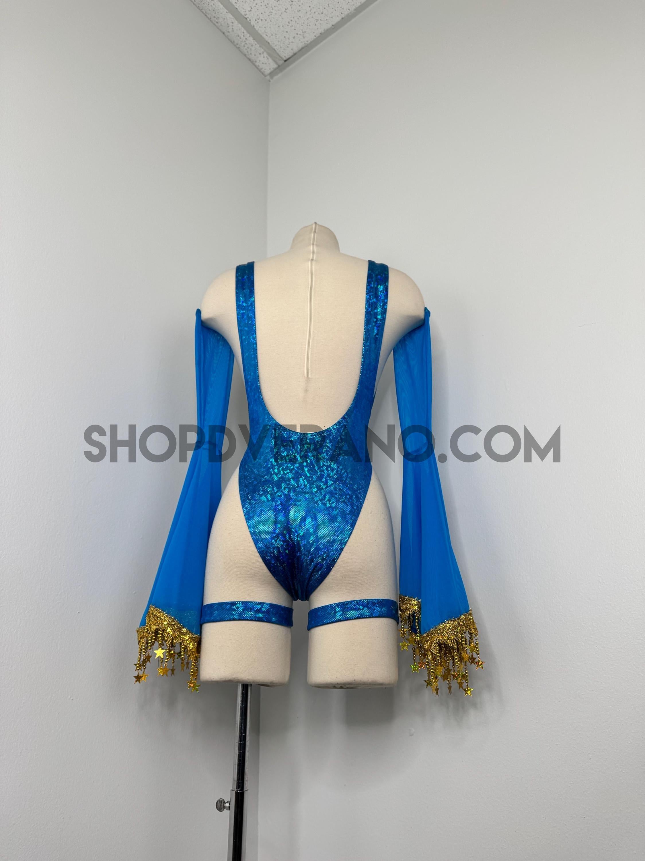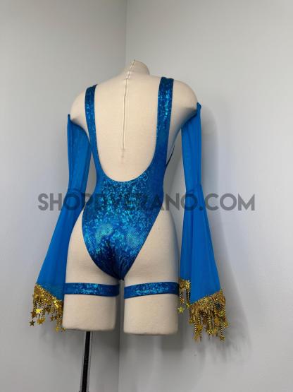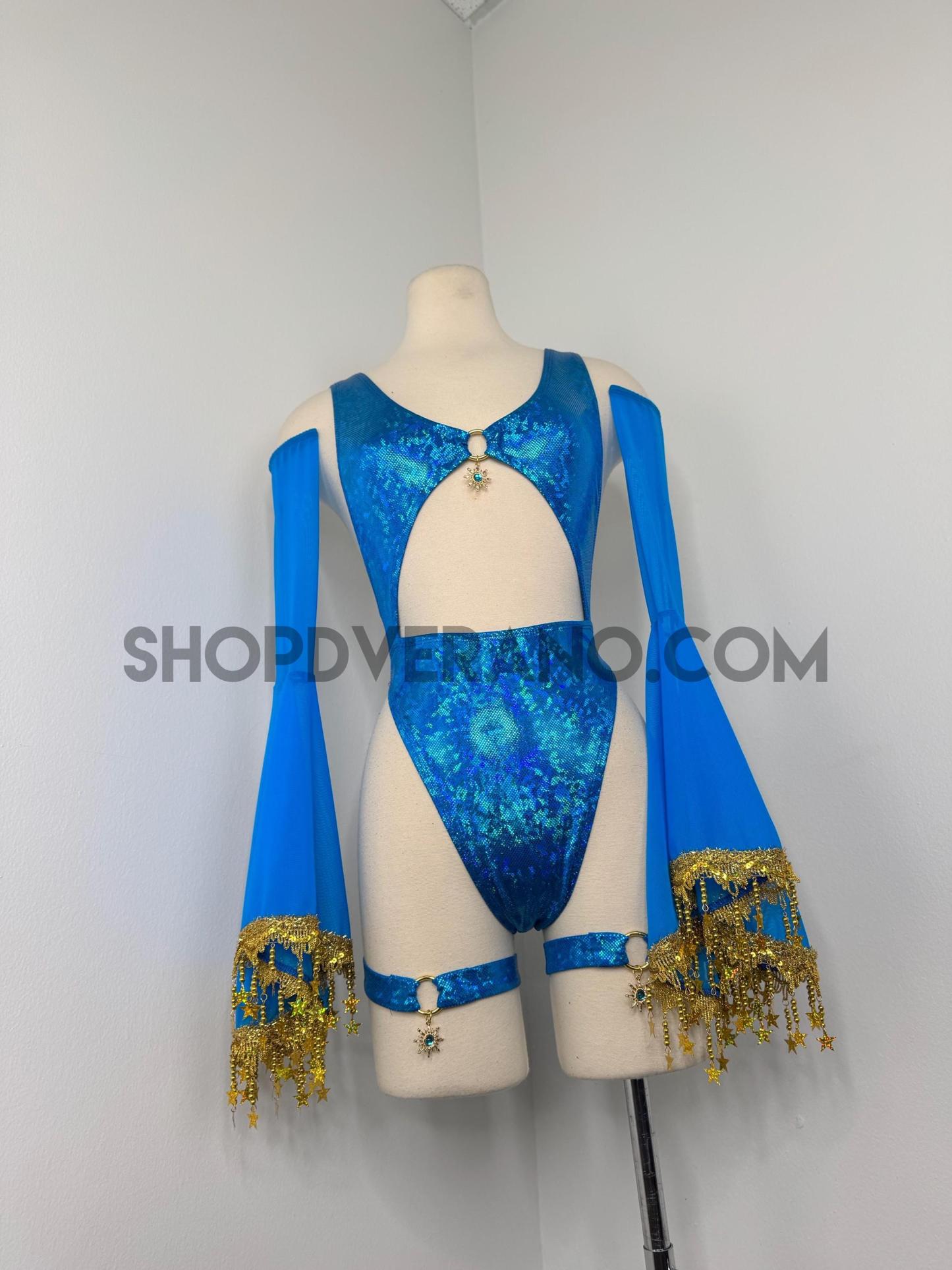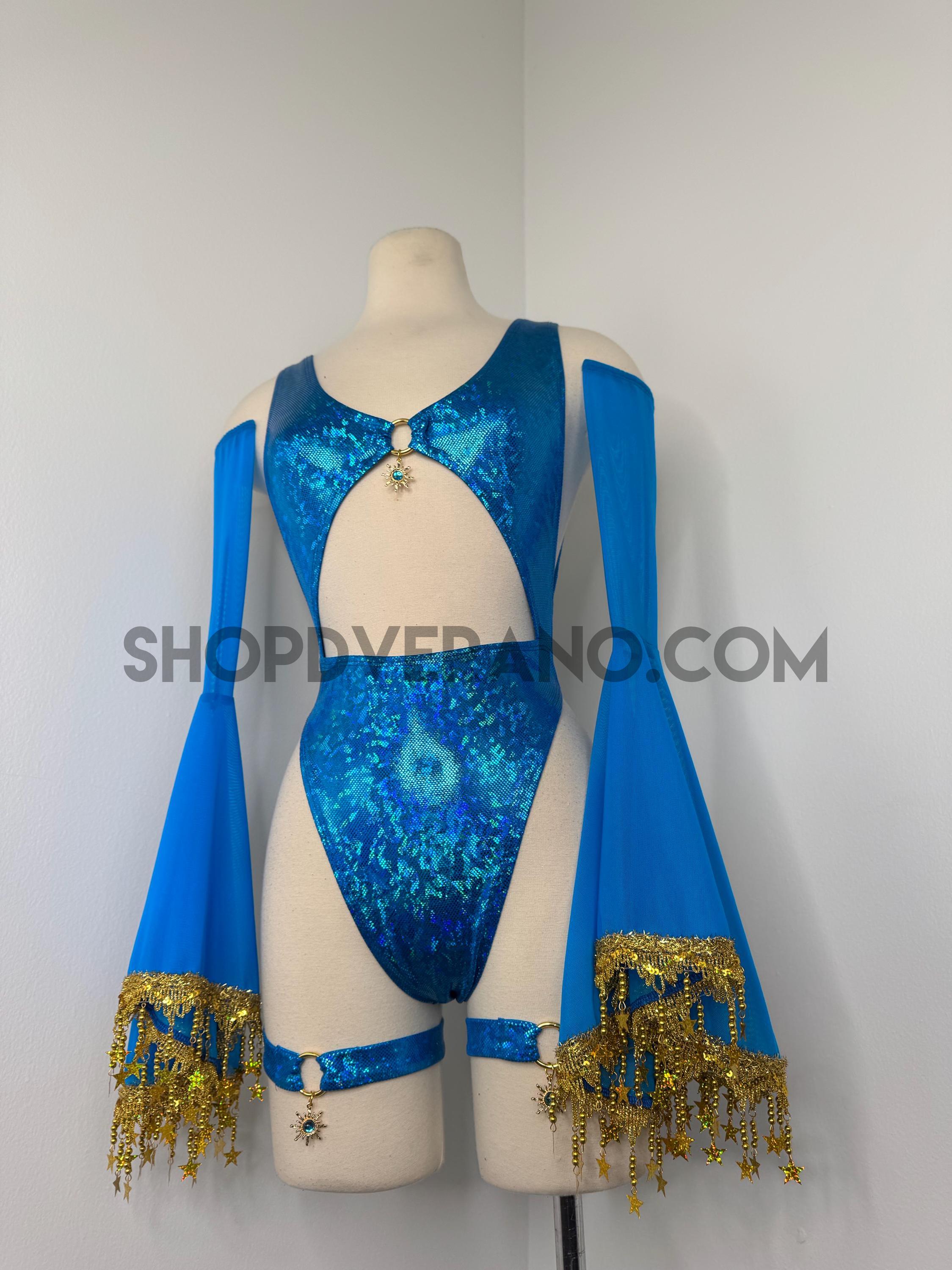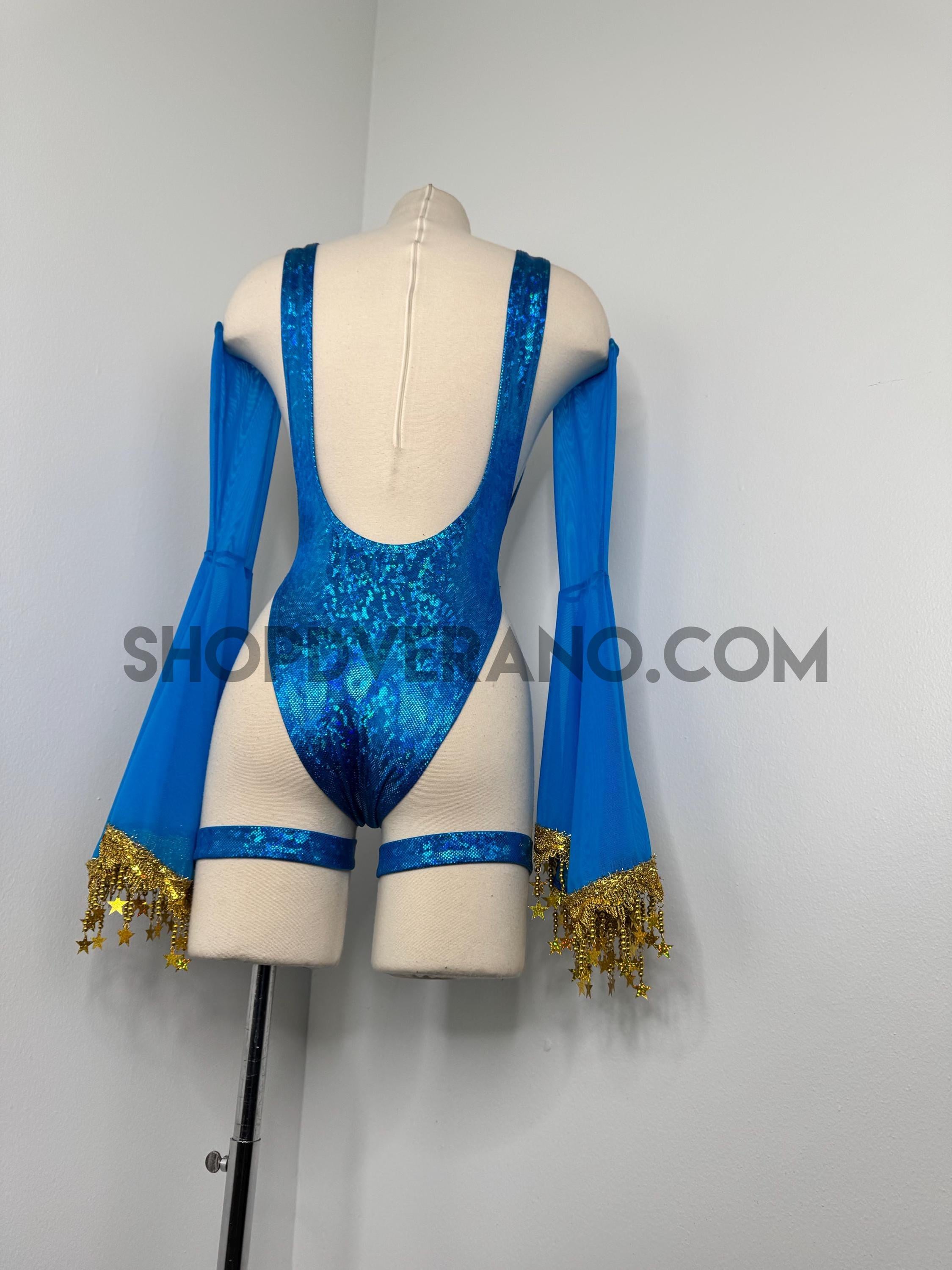 The look is elevated with a matching hooded bolero featuring star trim, adding celestial drama and movement, while flowing sleeves create an ethereal, siren-inspired silhouette. Elastic legs straps finish the look with a bold, statement touch that ties the entire set together.