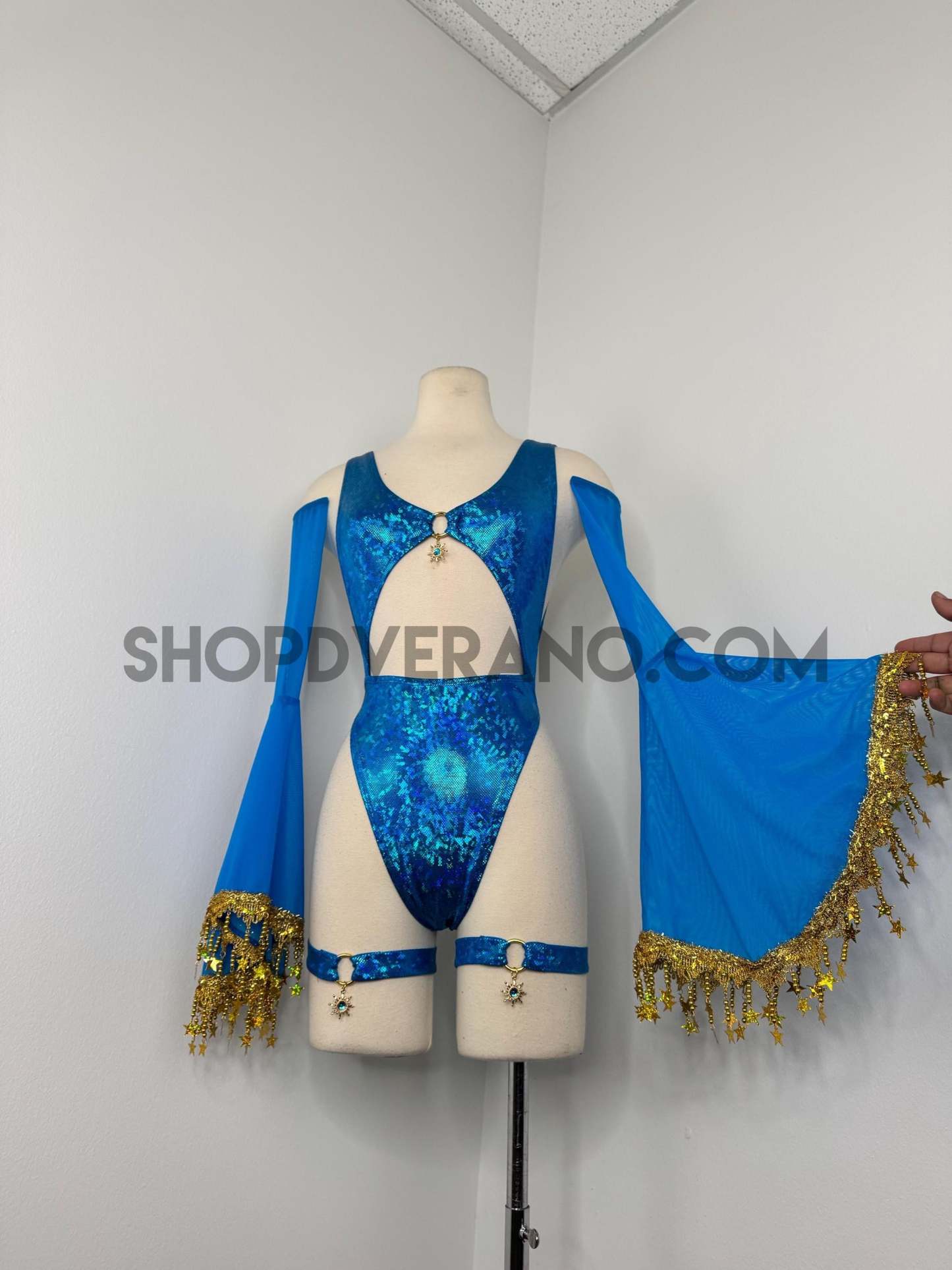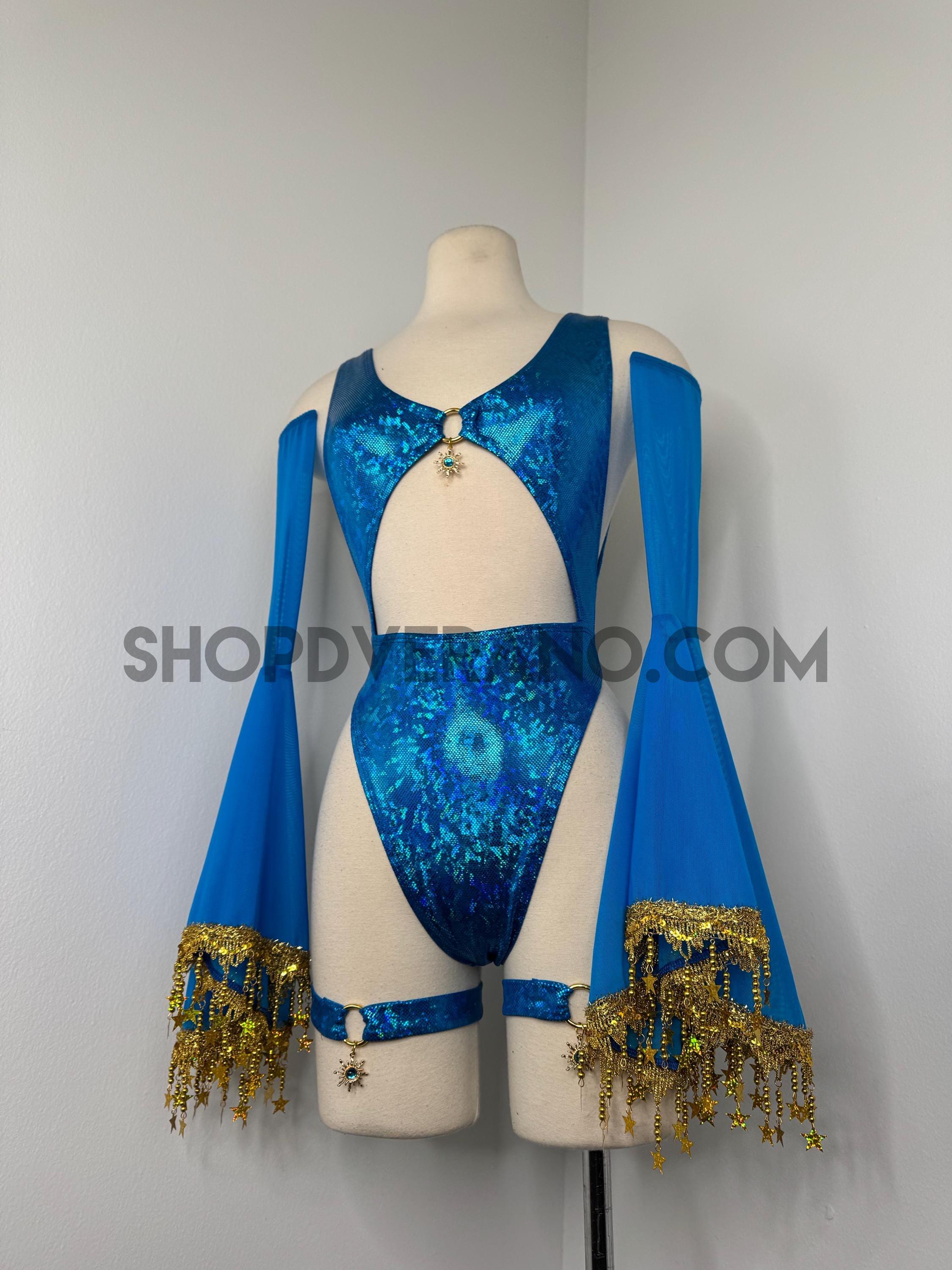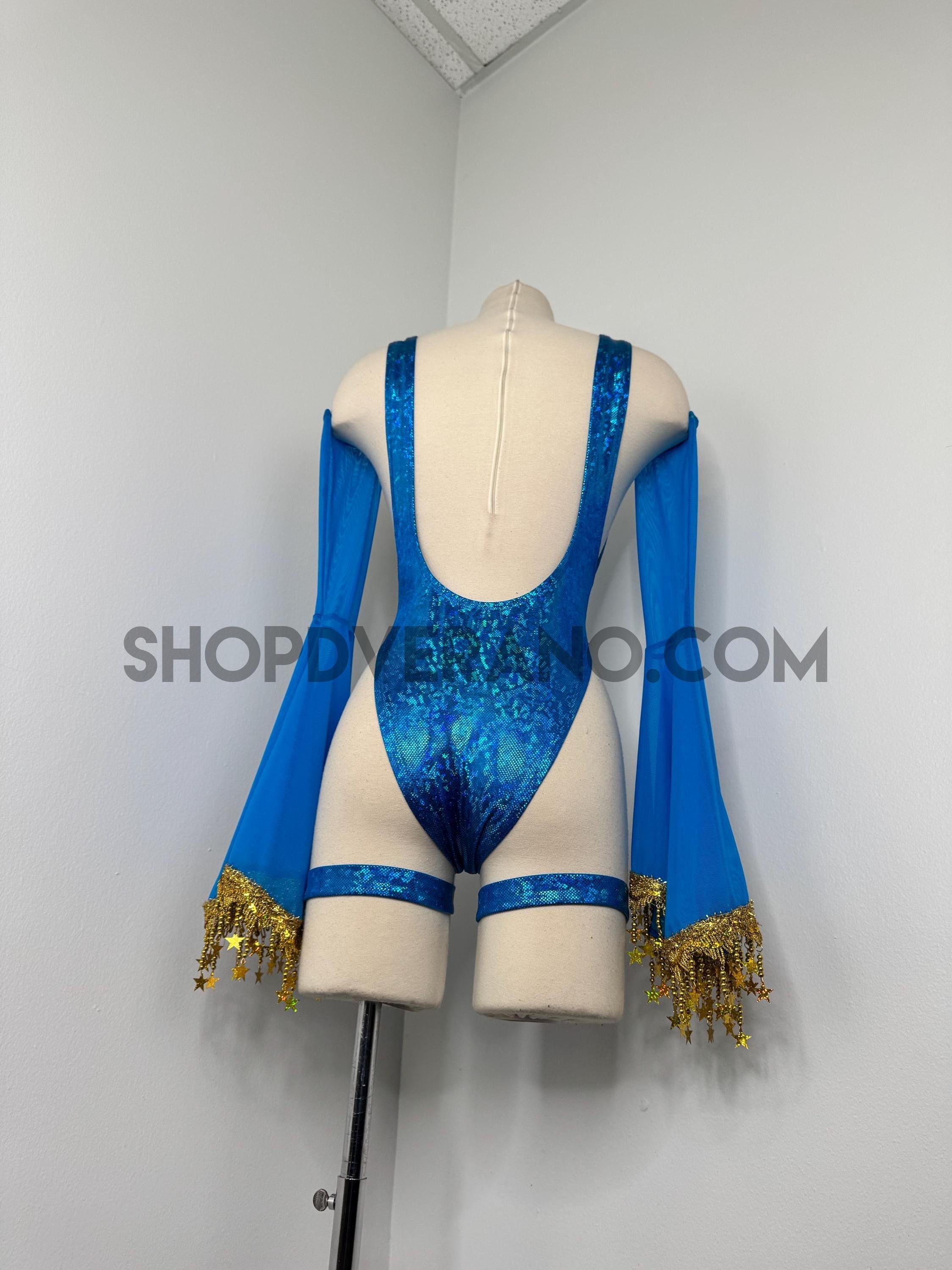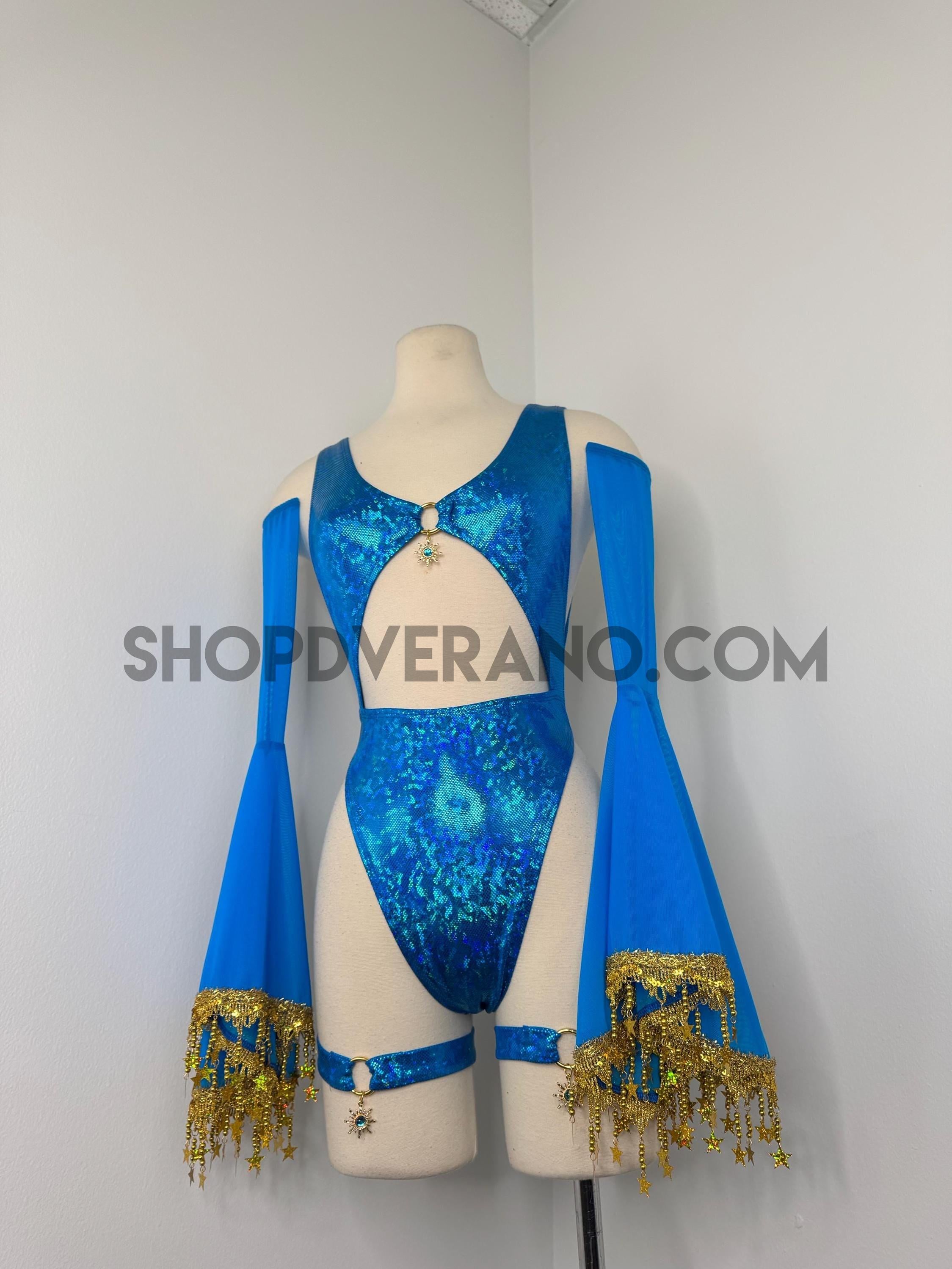 The look is elevated with a matching hooded bolero featuring star trim, adding celestial drama and movement, while flowing sleeves create an ethereal, siren-inspired silhouette. Elastic legs straps finish the look with a bold, statement touch that ties the entire set together.