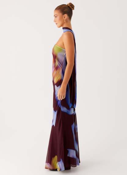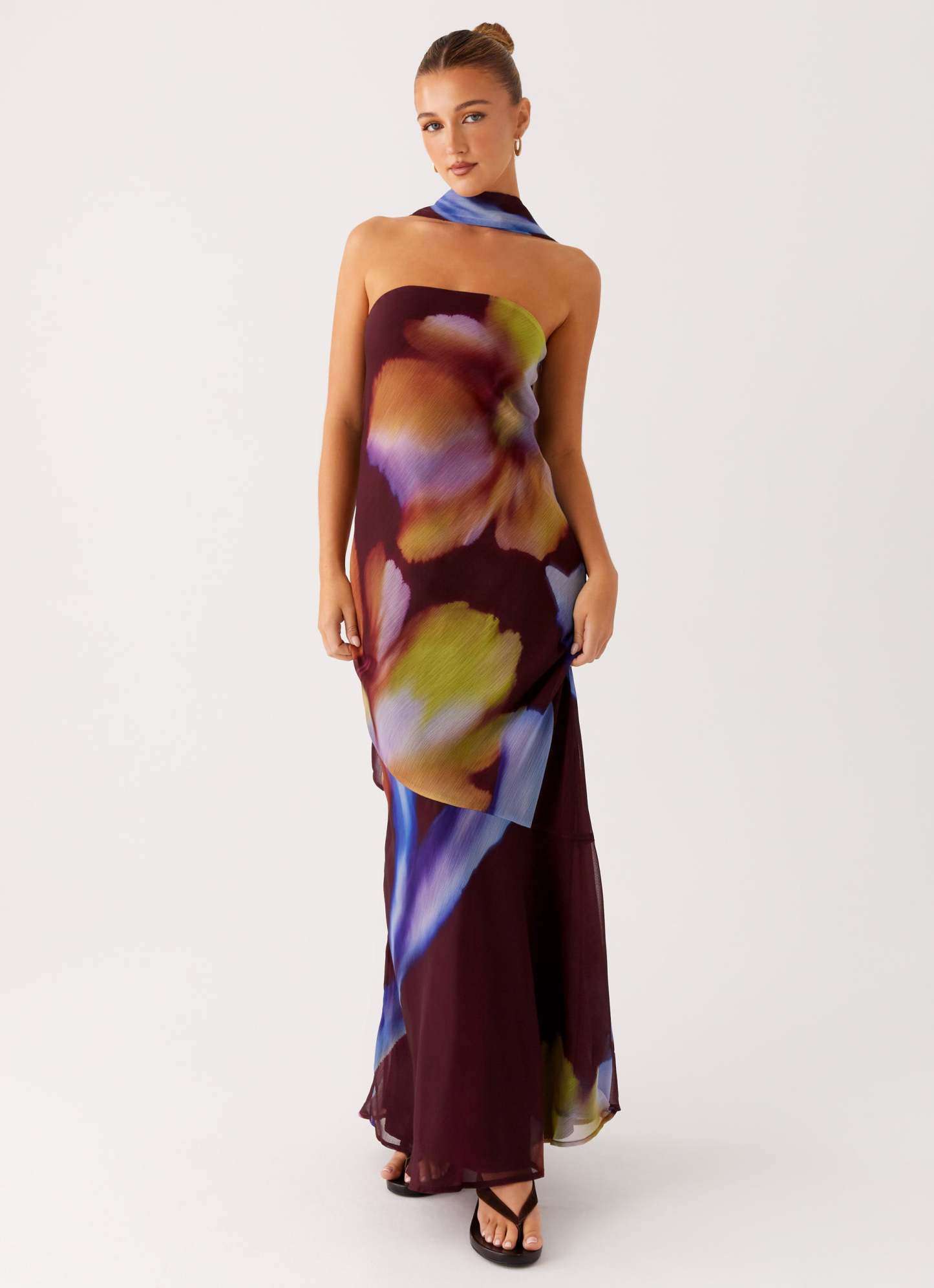 The Under The Pagoda Maxi Dress blooms with effortless charm in a vibrant orange floral print, made for golden hour moments and nights that never end. Featuring an elegant strapless neckline and an asymmetrical silhouette, this dress is crafted from a soft brushed chiffon that drapes beautifully over the figure. Complete with a matching scarf for a touch of elevated allure, it’s the ultimate statement piece for sunset-to-after-dark elegance.
